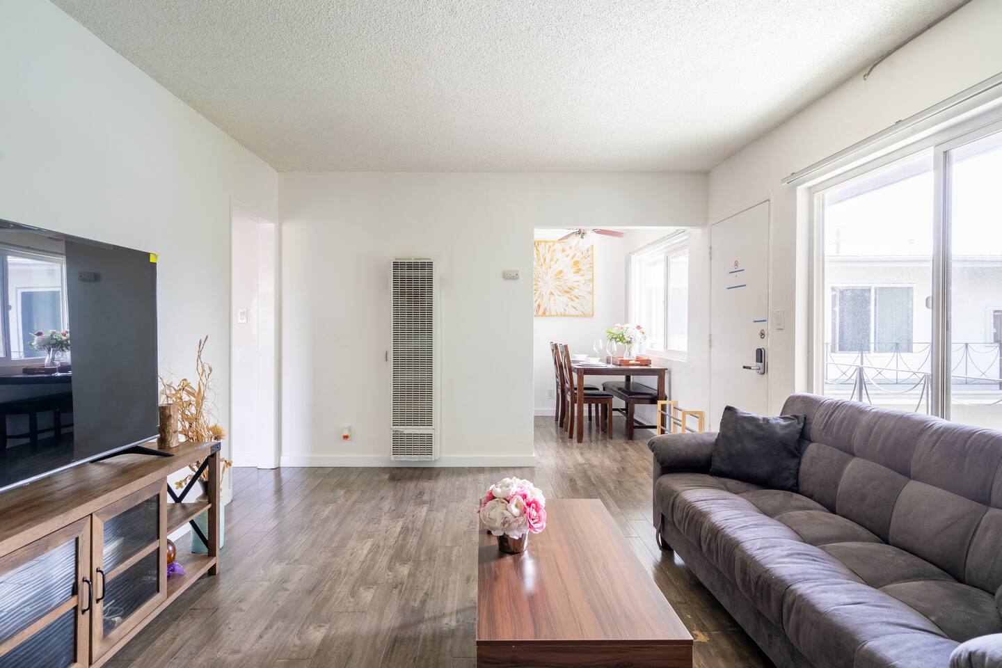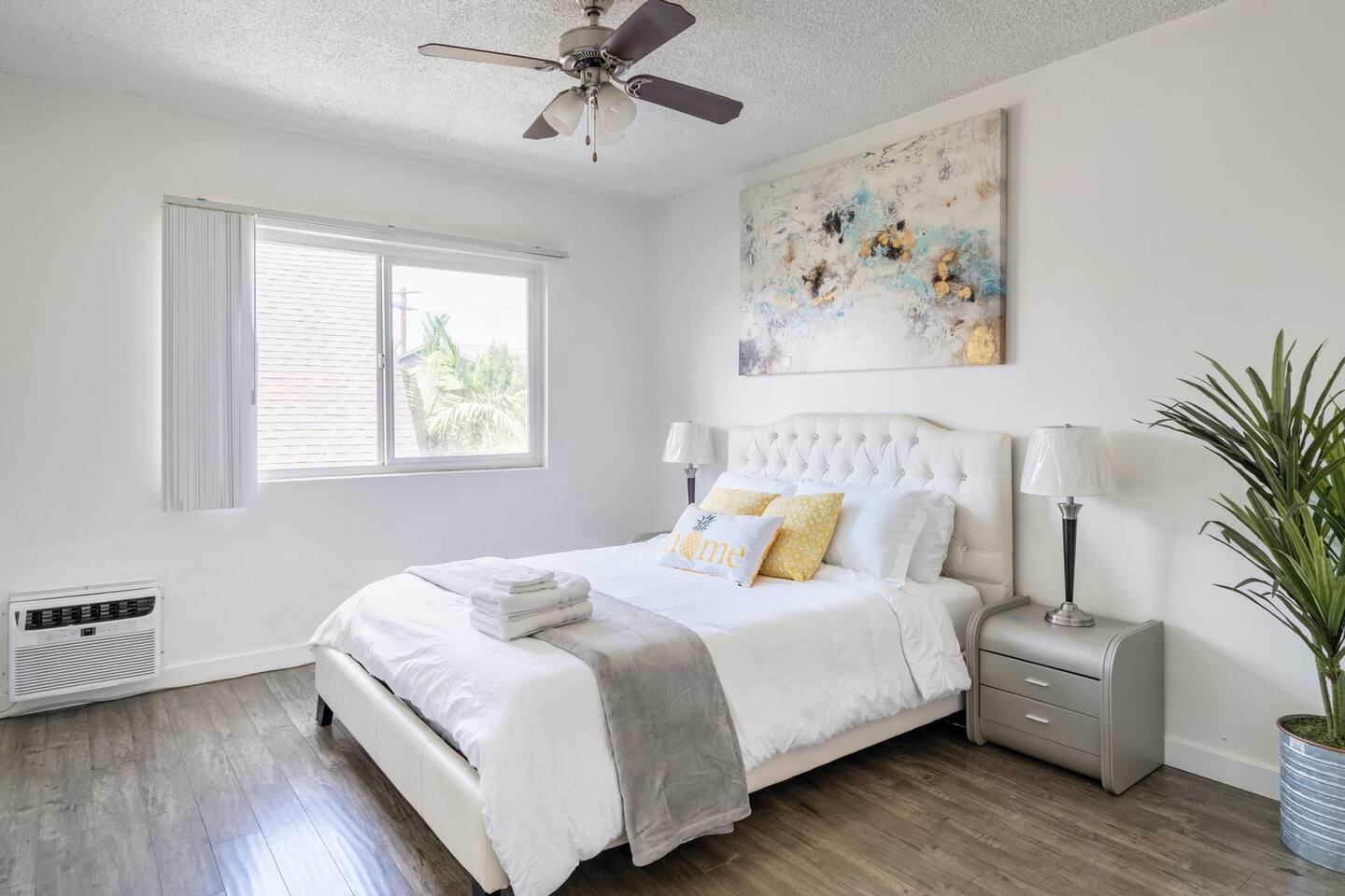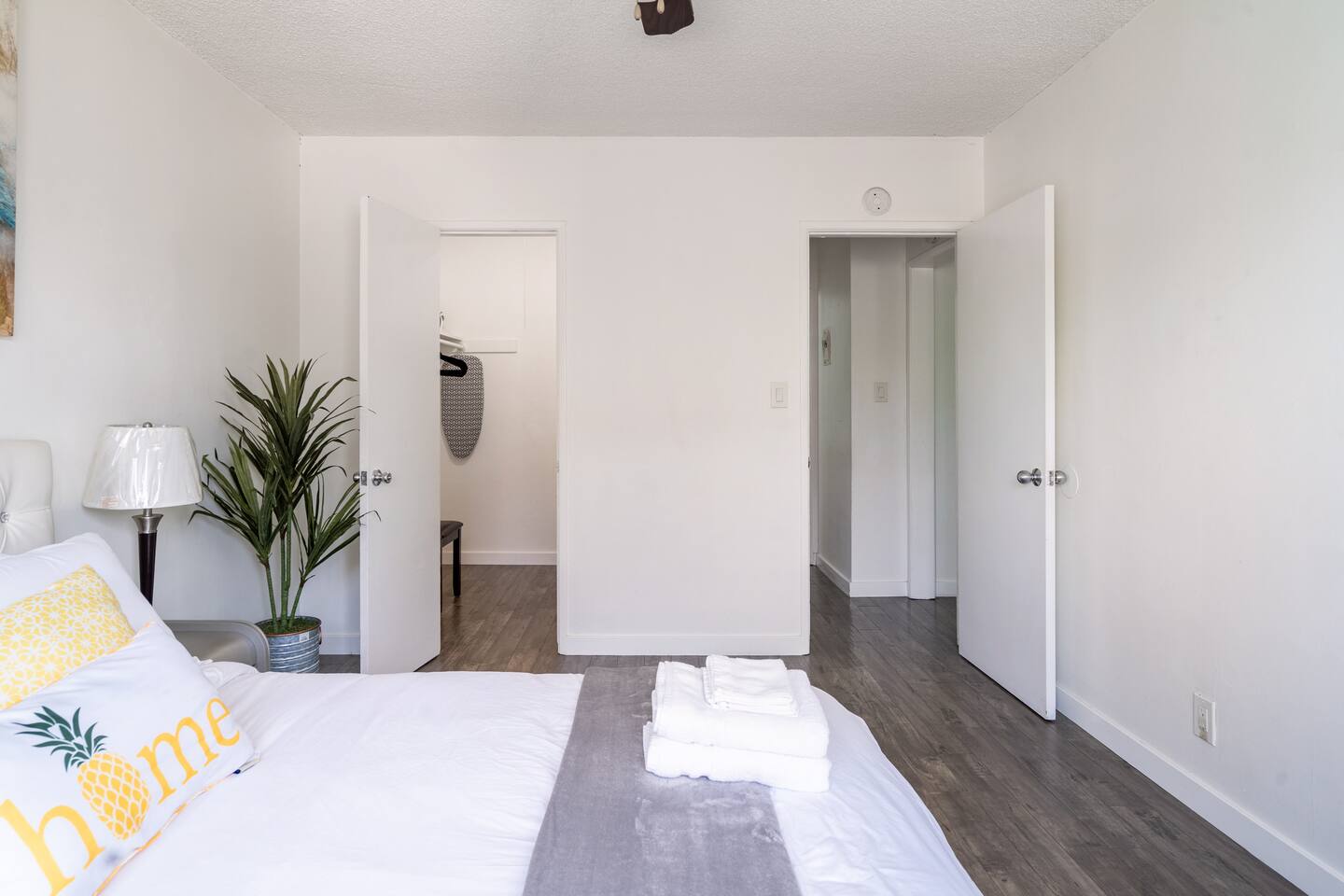 680 sq. ft. | 10-unit 2-story apartment complex | Upper floor unit BEDROOM : • ROOM 1 : Queen bed | Walk-in Closet | Iron and ironing board | Wall AC | Ceiling Fan BATHROOM : Handheld shower | Bathtub | Shampoo | Conditioner | Body wash | Hairdryer | Toilet paper | Towels LIVING ROOM AREA : Widescreen TV | Board games | Sofa | Coffee table KITCHEN/DINING AREA : Stove | Oven | Refrigerator | Microwave | Toaster | Water Kettle | Coffee maker | Brita Water Filter | Cooking utensils | Silverware | Oven mitts | Plates and bowls | Mugs, cups, wine glasses | Dining table PARKING : Dedicated parking lot (1 Spot only) | Street parking has cleaning schedule restrictions LAUNDRY - WASHER/DRYER : Our apartment complex has a SHARED coin-operated laundry machines. AC/HEAT : Wall AC | Ceiling fan LOCATION : This unit is located in a super convenient city area. - Close to 60, 5, -605, and 57 freeways. - Close to shopping mall, restaurants, gas station and supermarket: Walmart, Trader Joe’s, Whole Foods. - At only 25 minute to Disneyland, 30min to L.A downtown, or 35 min to Longbeach.