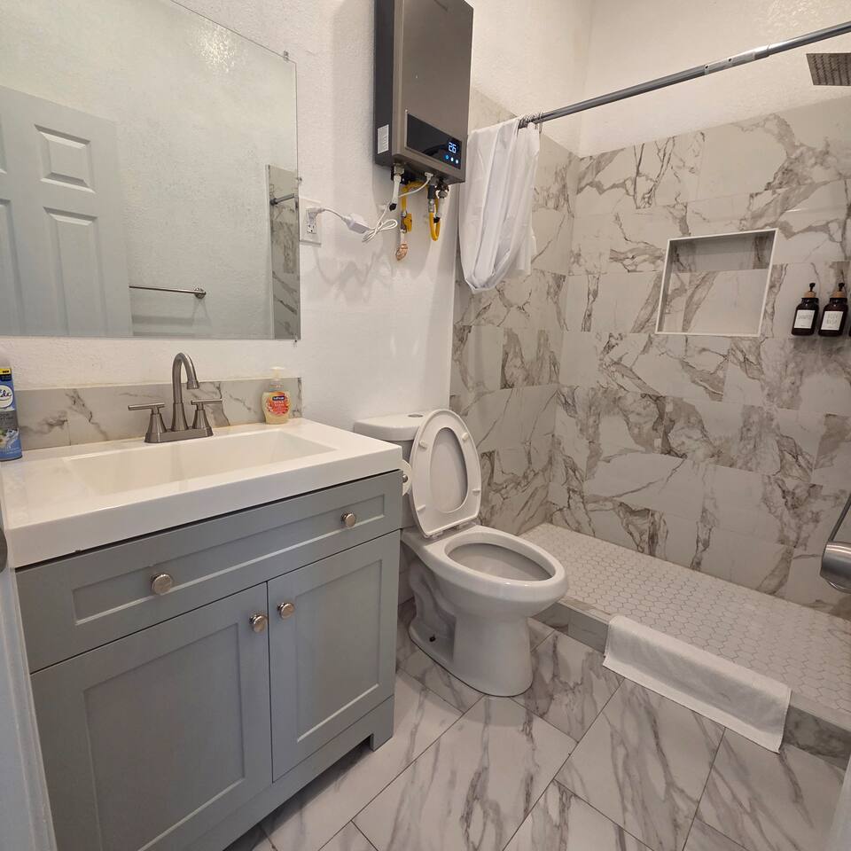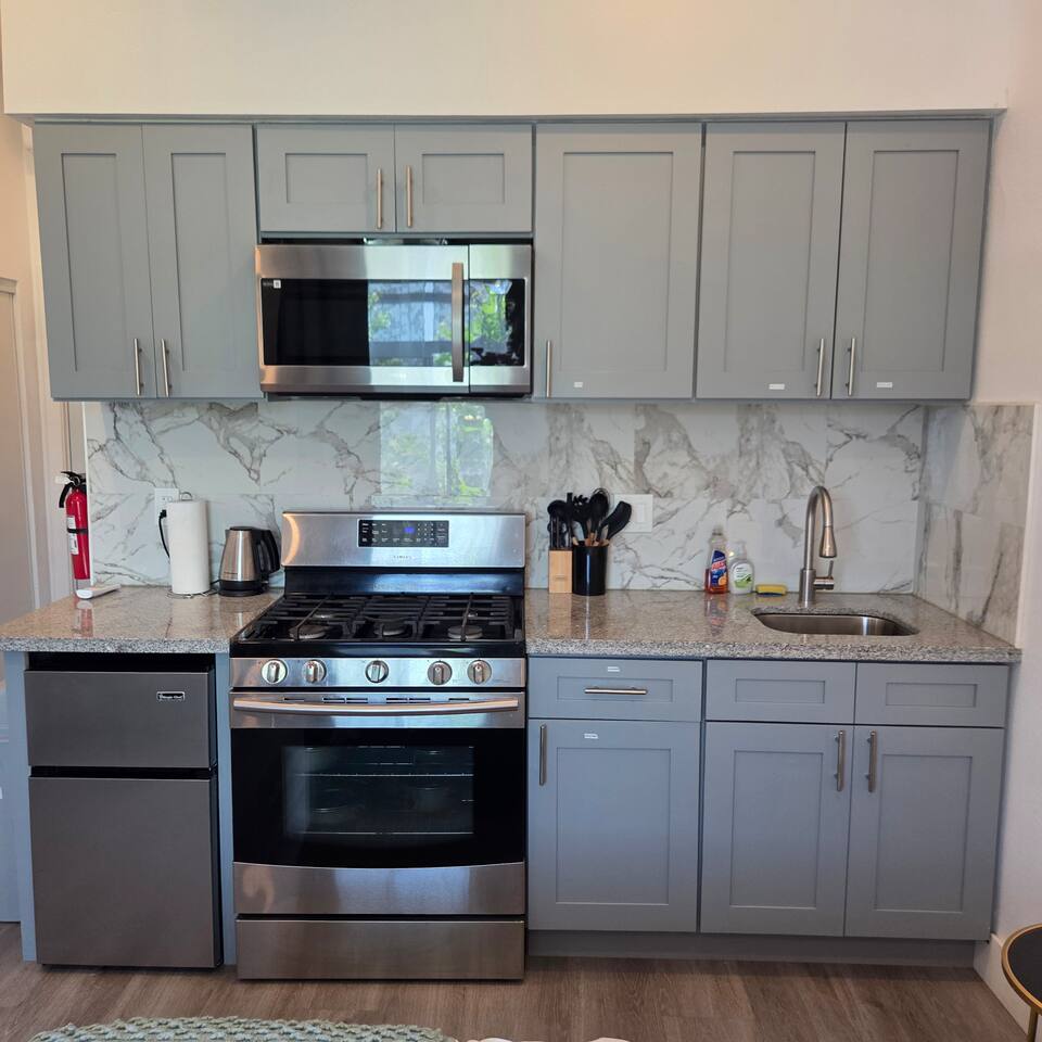 250 sq. ft. | Apartment / Studio | Second-floor unit BEDROOM : • ROOM 1 : Queen bed | Wall mounted smart TV | Iron and ironing board | Split AC BATHROOM : Rain shower head | Handheld shower | Shampoo | Conditioner | Body wash | Hairdryer | Toilet paper | Towels KITCHEN / DINING AREA : Stove | Oven | Refrigerator | Microwave | Toaster | Water Kettle | Coffee maker | Brita Water Filter | Cooking utensils | Silverware | Oven mitts | Plates and bowls | Mugs, cups, wine glasses | Dining table