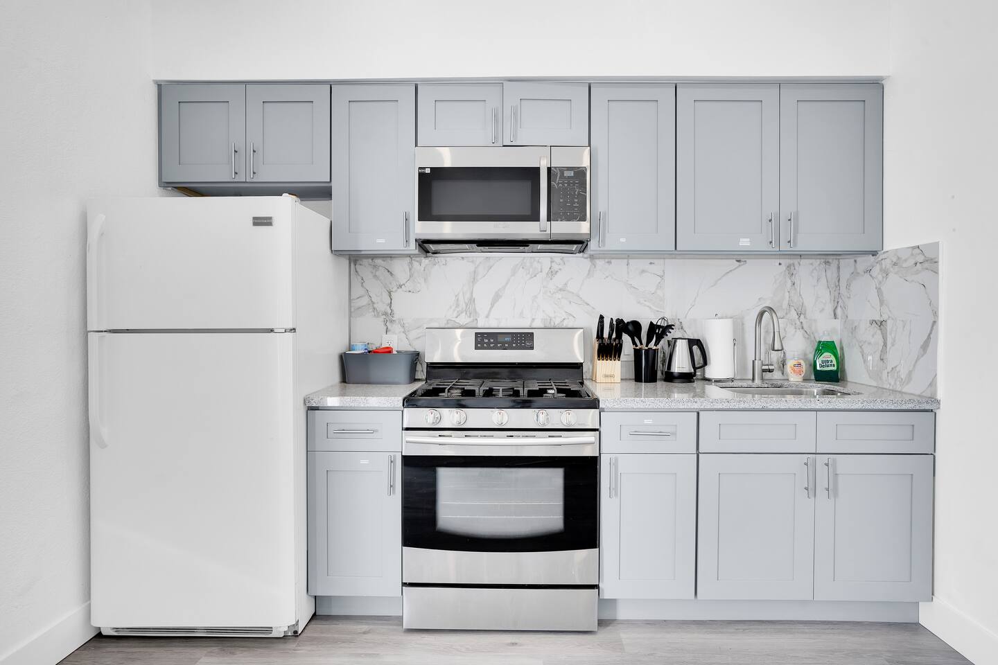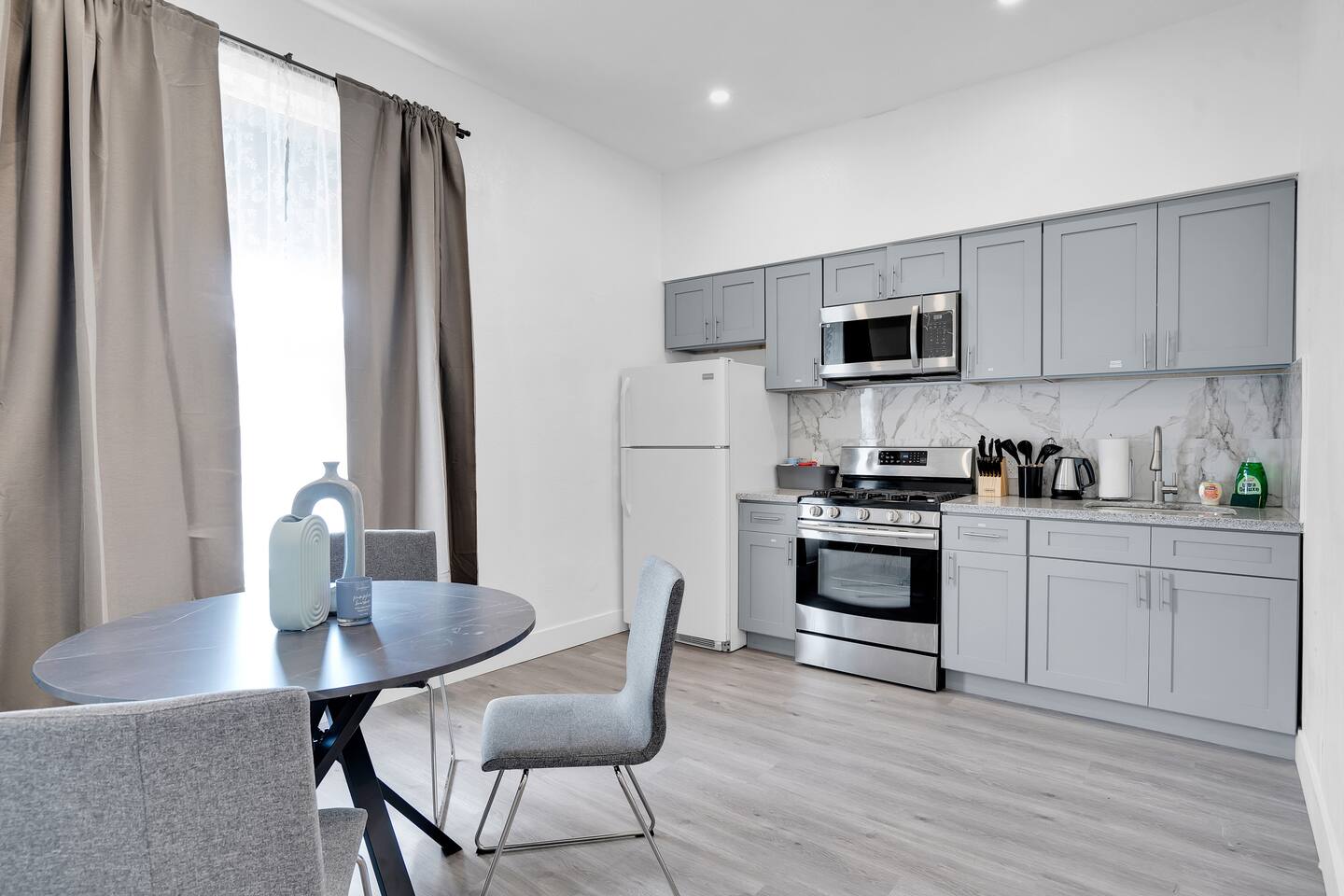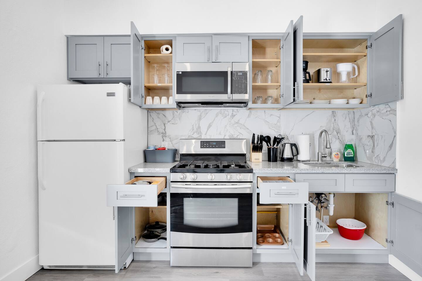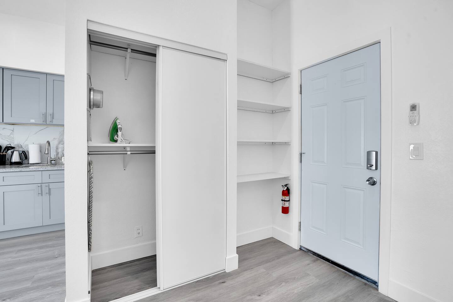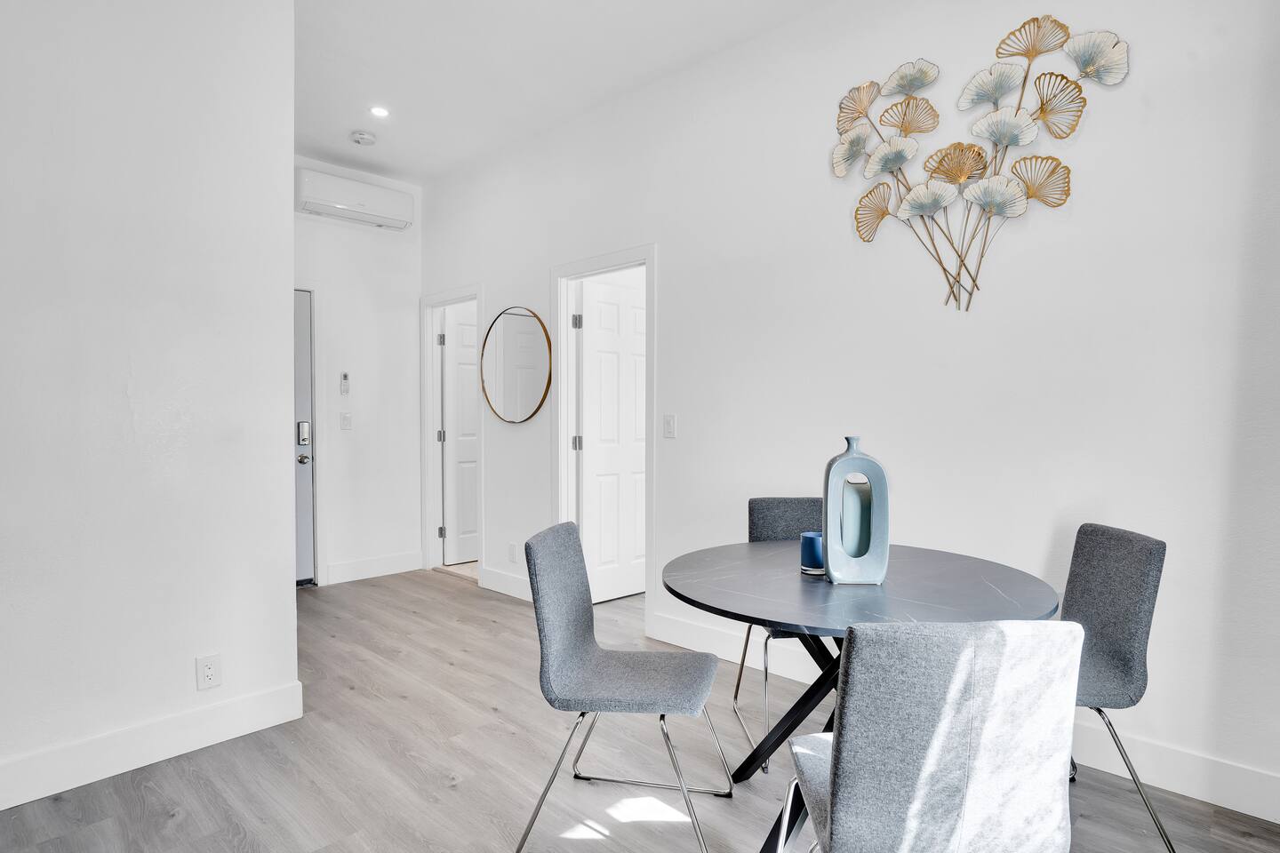 700 sq. ft. | Apartment | Second-floor unit BEDROOM : Queen bed | Wall mounted smart TV | Closet | Iron and ironing board | BATHROOM : Rain shower head | Handheld shower | Shampoo | Conditioner | Body wash | Hairdryer | Toilet paper | Towels KITCHEN / DINING AREA : Stove | Oven | Refrigerator | Microwave | Toaster | Water Kettle | Coffee maker | Brita Water Filter | Cooking utensils | Silverware | Oven mitts | Plates and bowls | Mugs, cups, wine glasses | Dining table | Split A/C PARKING : Parking at back of the property. Street parking also available AC/HEAT : Split AC is used in this unit LOCATION : Ontario Central Downtown | Commercial area on ground floor ELECTRIC CAR : Tesla Supercharger available across the street Driving distances : Ontario International Airport - 3.7 mi, Ontario Convention Center - 3 mi, Ontario Mills Shopping Mall - 6.6 mi, Cucamonga-Guasti Regional Park - 4.7 mi, Downtown Los Angeles - 41.6 mi, Los Angeles International Airport - 54.7 mi, Disneyland - 30.2 mi, Universal Studios - 49.3 mi.