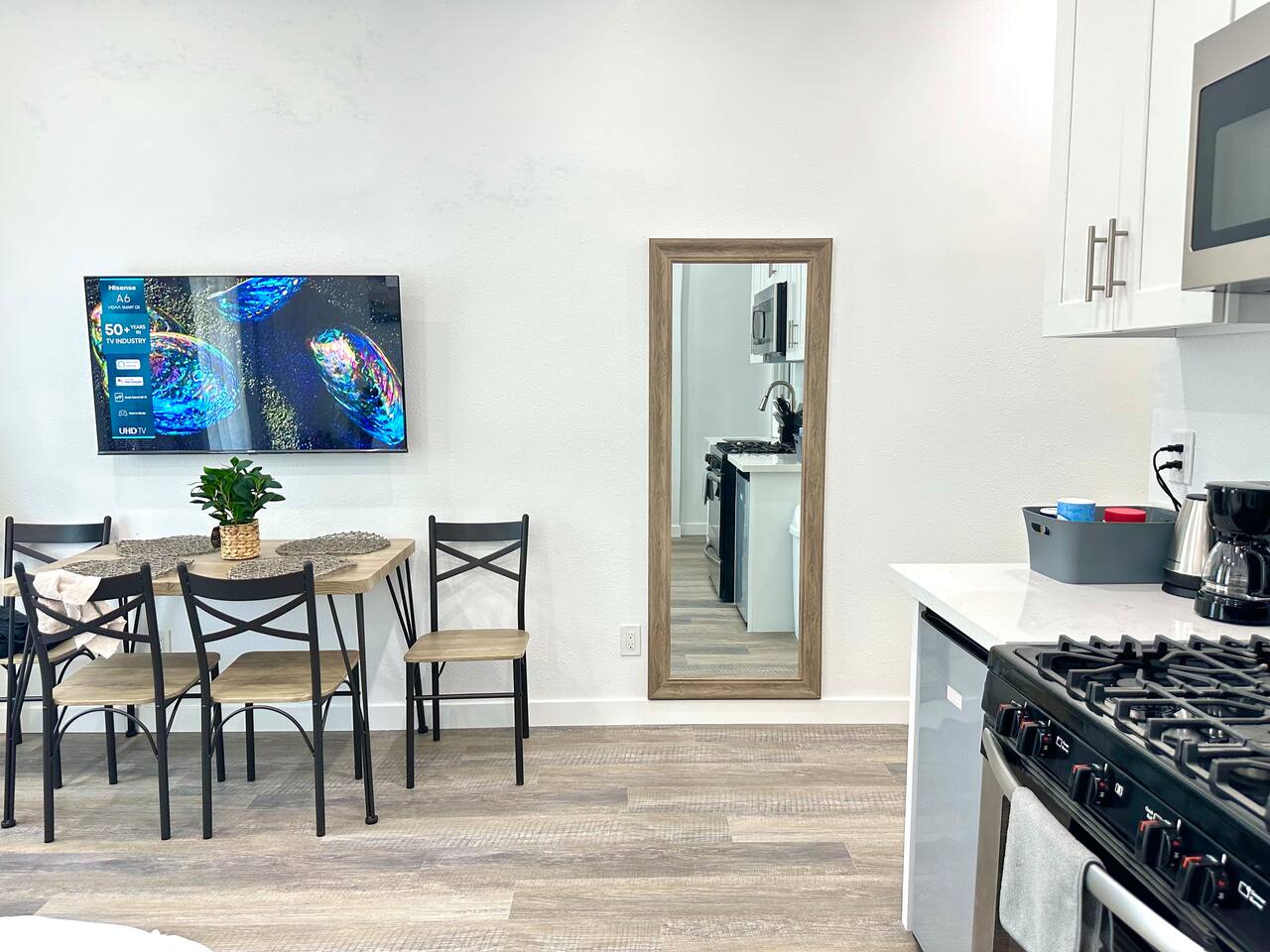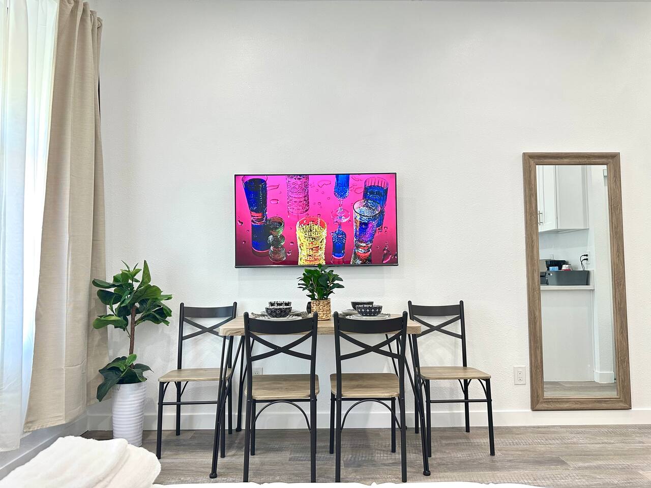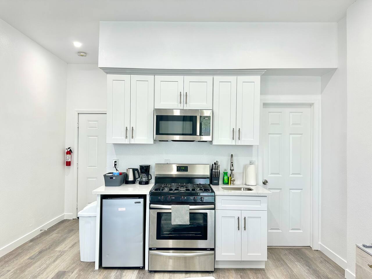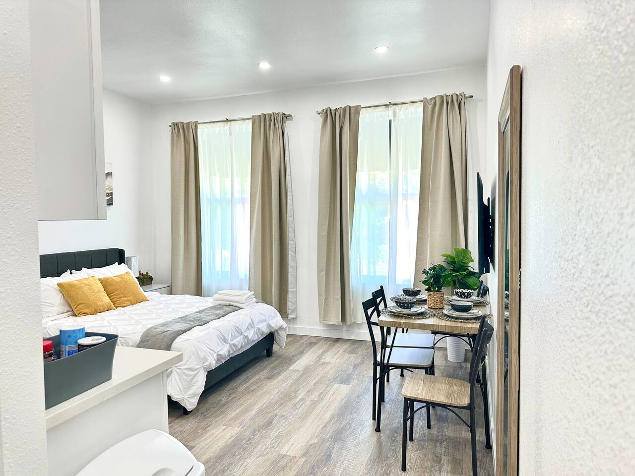 450 sq. ft. | Apartment / Studio | Second-floor unit BEDROOM : • ROOM 1 : Queen bed | Wall mounted smart TV | Closet | Iron and ironing board | Split AC | Board Games BATHROOM : Rain shower head | Handheld shower | Shampoo | Conditioner | Body wash | Hairdryer | Toilet paper | Towels KITCHEN / DINING AREA : Stove | Oven | Refrigerator | Microwave | Toaster | Water Kettle | Coffee maker | Brita Water Filter | Cooking utensils | Silverware | Oven mitts | Plates and bowls | Mugs, cups, wine glasses | Dining table AC/HEAT : Split AC is used in this unit LAUNDRY ROOM : - In building (7AM - 10 PM) - Shared - Coin Operated PARKING : Parking at back of the property. Street parking also available ELECTRIC CAR : Tesla Supercharger available across the street LOCATION : Ontario Central Downtown | Commercial area on ground floor Driving distances : Ontario International Airport - 3.7 mi, Ontario Convention Center - 3 mi, Ontario Mills Shopping Mall - 6.6 mi, Cucamonga-Guasti Regional Park - 4.7 mi, Downtown Los Angeles - 41.6 mi, Los Angeles International Airport - 54.7 mi, Disneyland - 30.2 mi, Universal Studios - 49.3 mi.