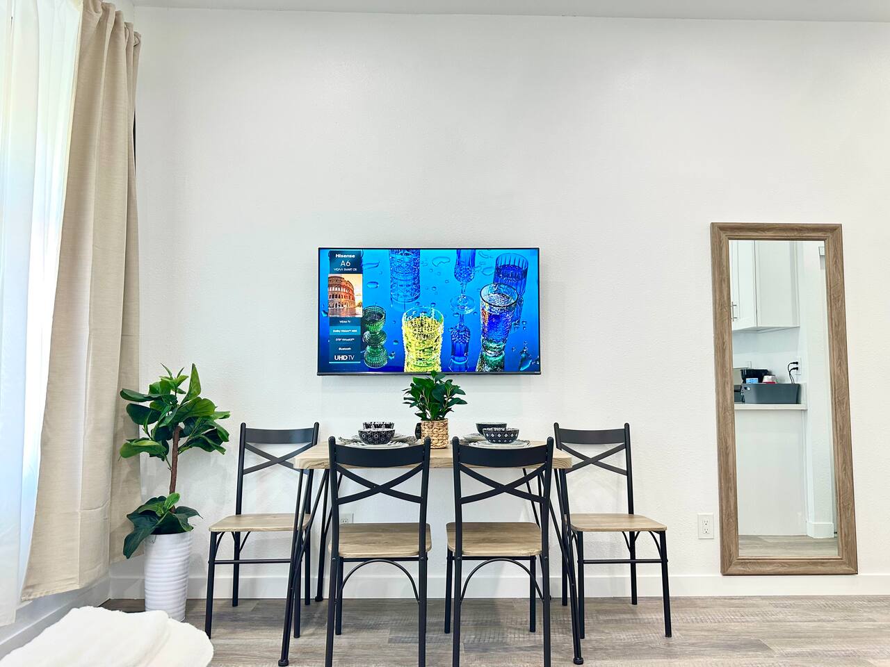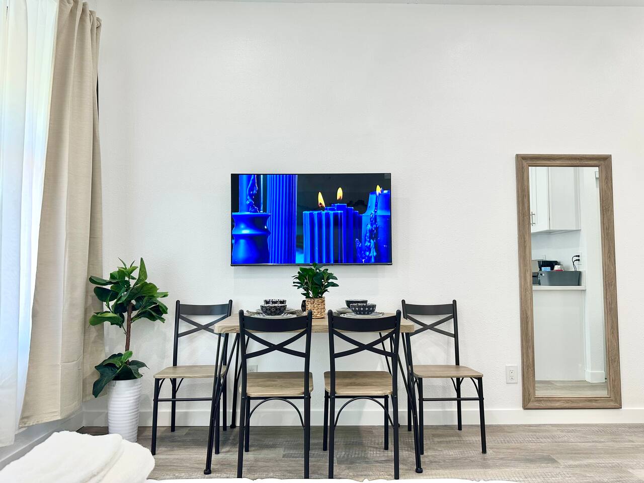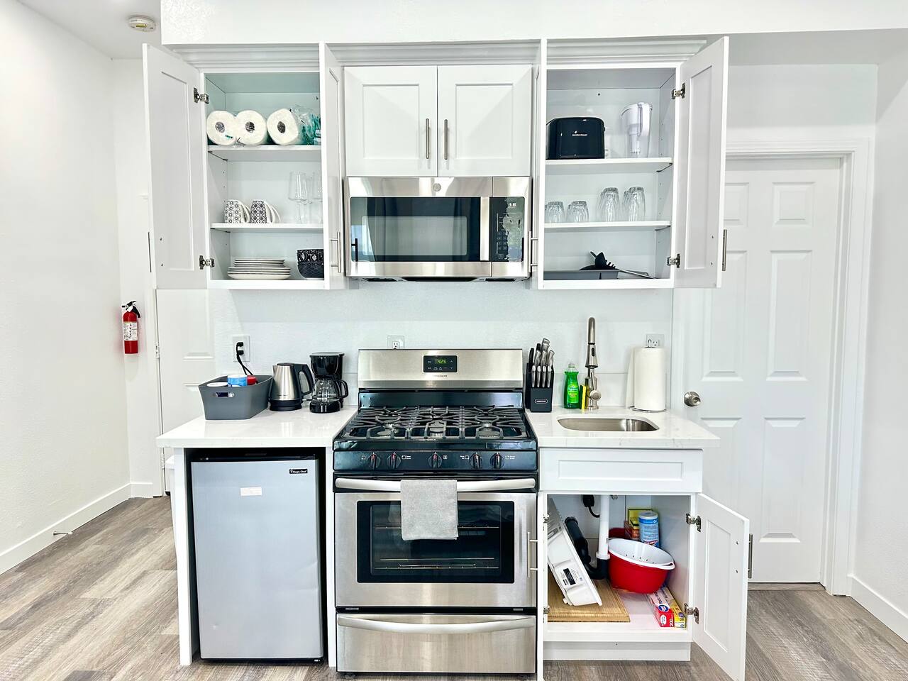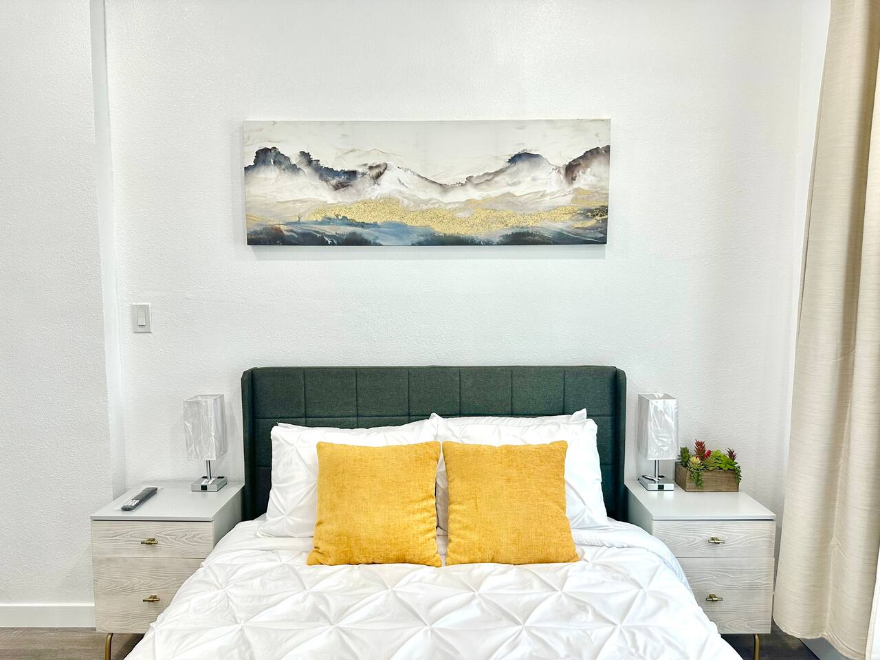 450 sq. ft. | Apartment / Studio | Second-floor unit BEDROOM : • ROOM 1 : Queen bed | Wall mounted smart TV | Closet | Iron and ironing board | Split AC | Board Games BATHROOM : Rain shower head | Handheld shower | Shampoo | Conditioner | Body wash | Hairdryer | Toilet paper | Towels KITCHEN / DINING AREA : Stove | Oven | Refrigerator | Microwave | Toaster | Water Kettle | Coffee maker | Brita Water Filter | Cooking utensils | Silverware | Oven mitts | Plates and bowls | Mugs, cups, wine glasses | Dining table AC/HEAT : Split AC is used in this unit LAUNDRY ROOM : - In building (7AM - 10 PM) - Shared - Coin Operated PARKING : Parking at back of the property. Street parking also available ELECTRIC CAR : Tesla Supercharger available across the street LOCATION : Ontario Central Downtown | Commercial area on ground floor Driving distances : Ontario International Airport - 3.7 mi, Ontario Convention Center - 3 mi, Ontario Mills Shopping Mall - 6.6 mi, Cucamonga-Guasti Regional Park - 4.7 mi, Downtown Los Angeles - 41.6 mi, Los Angeles International Airport - 54.7 mi, Disneyland - 30.2 mi, Universal Studios - 49.3 mi.