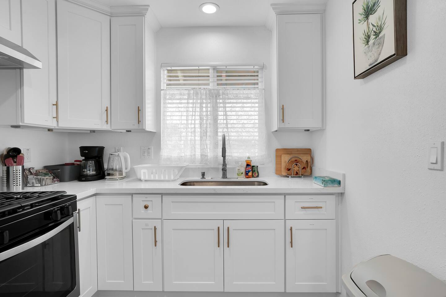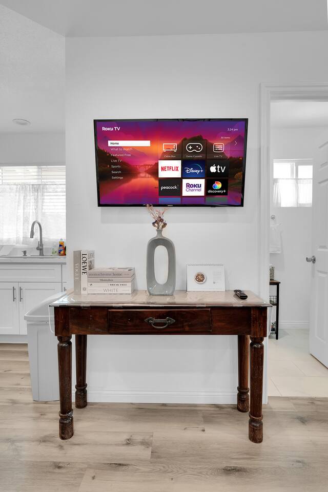 600 sq. ft. | Quadruplex property | 1 Bedroom unit BEDROOM AREA: Queen bed | Nightstands | Bedside lamps | Closet | Iron | Iron Board BATHROOM AREA: Shampoo | Conditioner | Body wash | Hairdryer | Toilet paper | Towels DINING AREA: Smart TV | Dining Table | Dining Chair (2 persons). Kitchen: Refrigerator | Microwave | Toaster | Water Kettle | Brita Water Filter | Cooking utensils | Silverware | Coffee maker | Baking tray | Plates and Bowls | Mugs, cups, and wine glasses PARKING: Street parking AC/HEAT: Split AC system. WASHER/DRYER: Laundry machines are free to use. They are shared with the other guests. The location This centrally located house is near from numerous supermarket, restaurants, shopping mall, and multiples freeways. It is at only 30 minute from L.A downtown, or Disneyland.