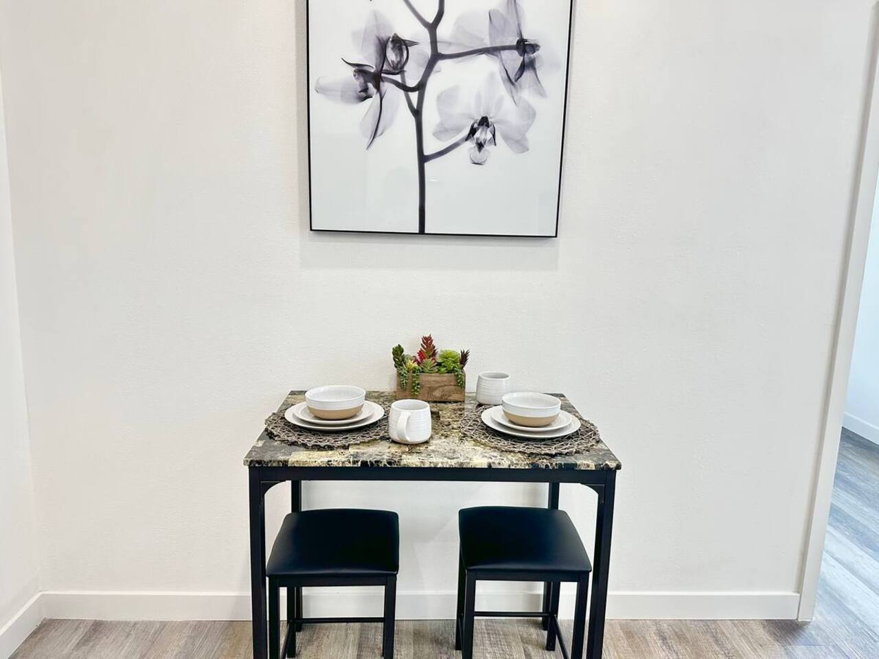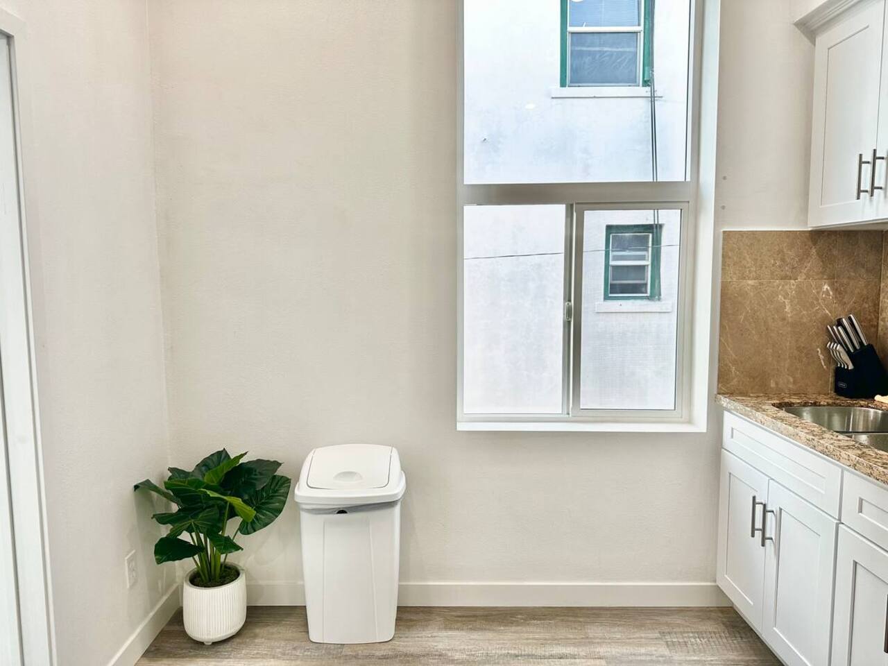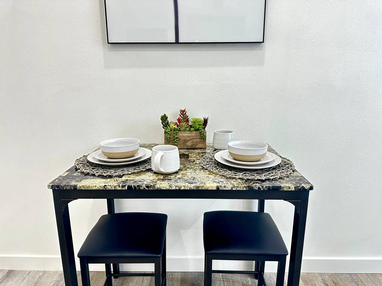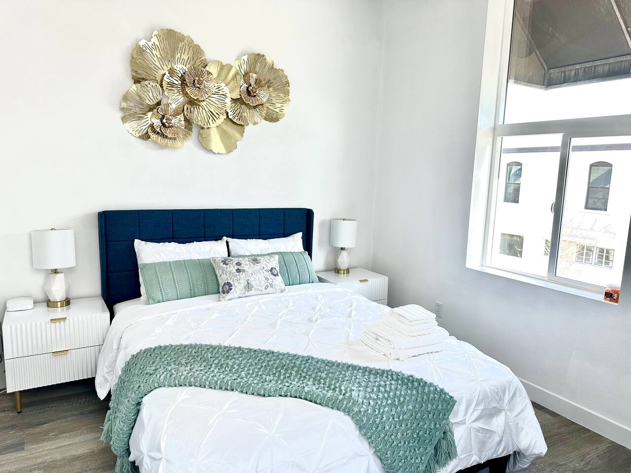 600 sq. ft. | Apartment | Second-floor unit BEDROOM : • ROOM 1 : Queen bed | Wall mounted smart TV | Closet | Iron and ironing board | Split AC | Board Games BATHROOM : Rain shower head | Handheld shower | Shampoo | Conditioner | Body wash | Hairdryer | Toilet paper | Towels KITCHEN / DINING AREA : Stove | Oven | Refrigerator | Microwave | Toaster | Water Kettle | Coffee maker | Brita Water Filter | Cooking utensils | Silverware | Oven mitts | Plates and bowls | Mugs, cups, wine glasses | Dining table AC/HEAT : Split AC is used in this unit LAUNDRY ROOM : - In building (7AM - 10 PM) - Shared - Coin Operated PARKING : Parking at back of the property. Street parking also available ELECTRIC CAR : Tesla Supercharger available across the street LOCATION : Ontario Central Downtown | Commercial area on ground floor Driving distances : Ontario International Airport - 3.7 mi, Ontario Convention Center - 3 mi, Ontario Mills Shopping Mall - 6.6 mi, Cucamonga-Guasti Regional Park - 4.7 mi, Downtown Los Angeles - 41.6 mi, Los Angeles International Airport - 54.7 mi, Disneyland - 30.2 mi, Universal Studios - 49.3 mi.