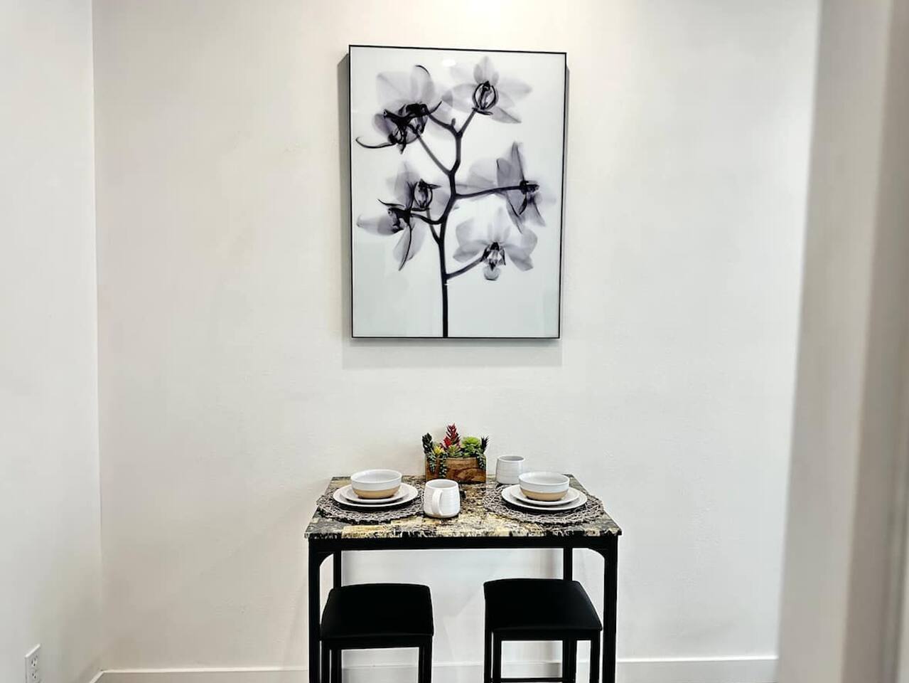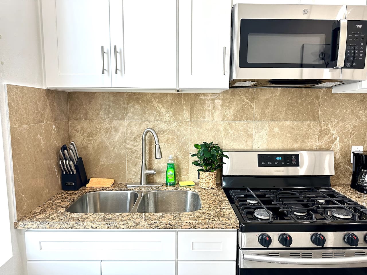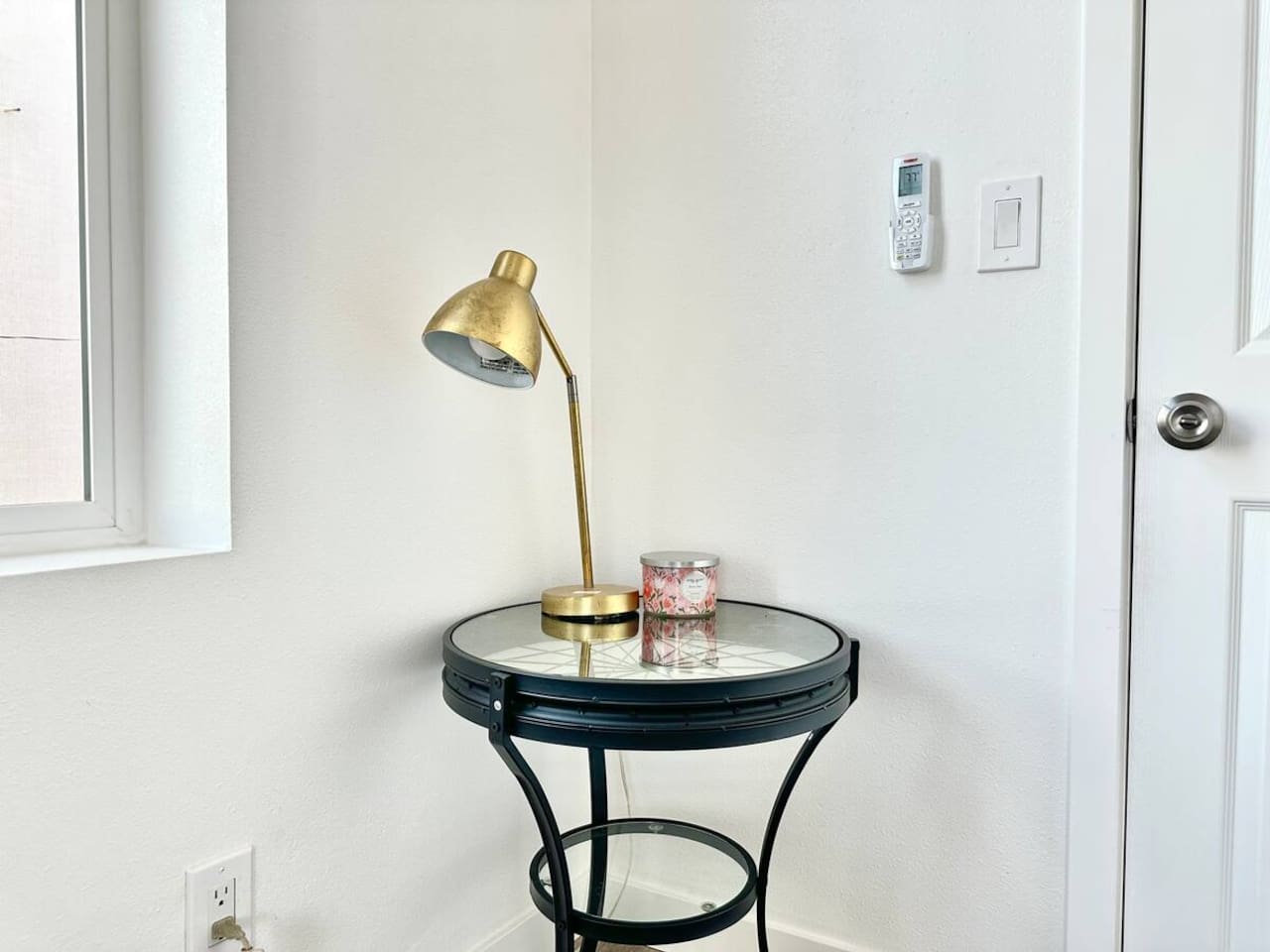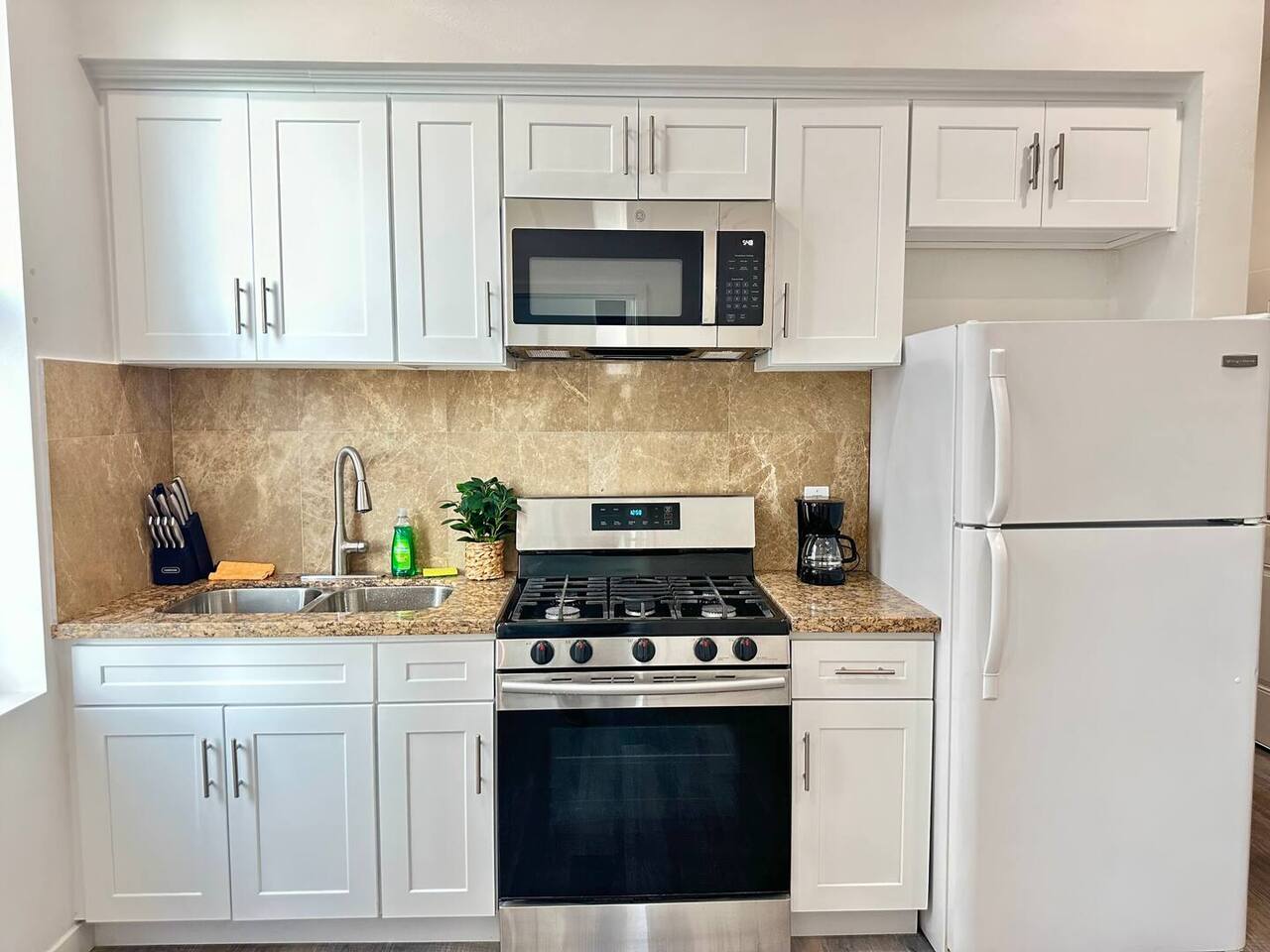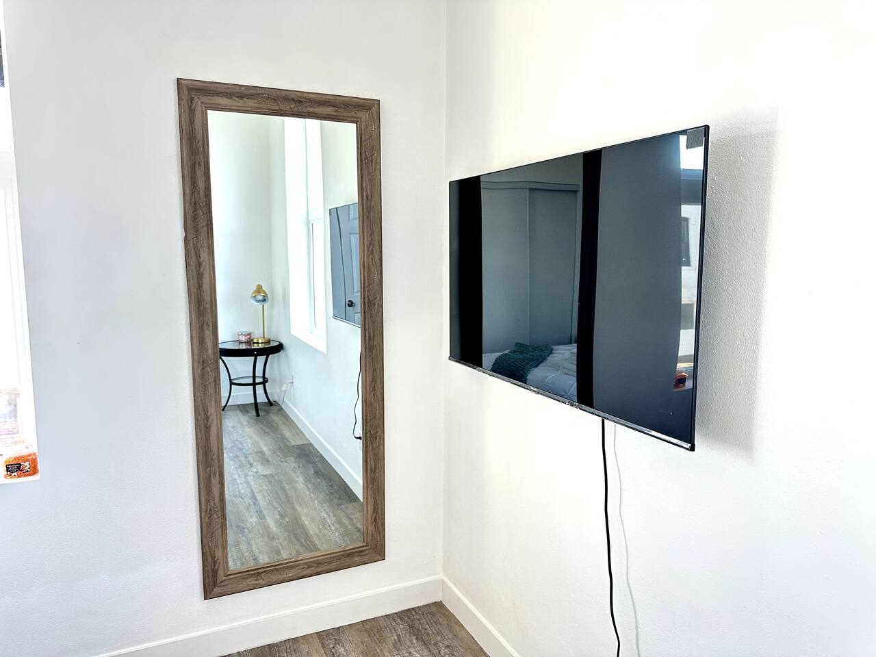 600 sq. ft. | Apartment | Second-floor unit BEDROOM : • ROOM 1 : Queen bed | Wall mounted smart TV | Closet | Iron and ironing board | Split AC | Board Games BATHROOM : Rain shower head | Handheld shower | Shampoo | Conditioner | Body wash | Hairdryer | Toilet paper | Towels KITCHEN / DINING AREA : Stove | Oven | Refrigerator | Microwave | Toaster | Water Kettle | Coffee maker | Brita Water Filter | Cooking utensils | Silverware | Oven mitts | Plates and bowls | Mugs, cups, wine glasses | Dining table AC/HEAT : Split AC is used in this unit LAUNDRY ROOM : - In building (7AM - 10 PM) - Shared - Coin Operated PARKING : Parking at back of the property. Street parking also available ELECTRIC CAR : Tesla Supercharger available across the street LOCATION : Ontario Central Downtown | Commercial area on ground floor Driving distances : Ontario International Airport - 3.7 mi, Ontario Convention Center - 3 mi, Ontario Mills Shopping Mall - 6.6 mi, Cucamonga-Guasti Regional Park - 4.7 mi, Downtown Los Angeles - 41.6 mi, Los Angeles International Airport - 54.7 mi, Disneyland - 30.2 mi, Universal Studios - 49.3 mi.