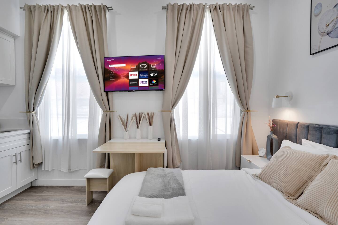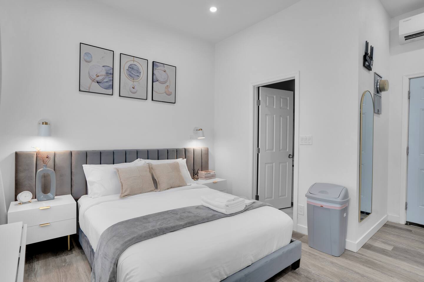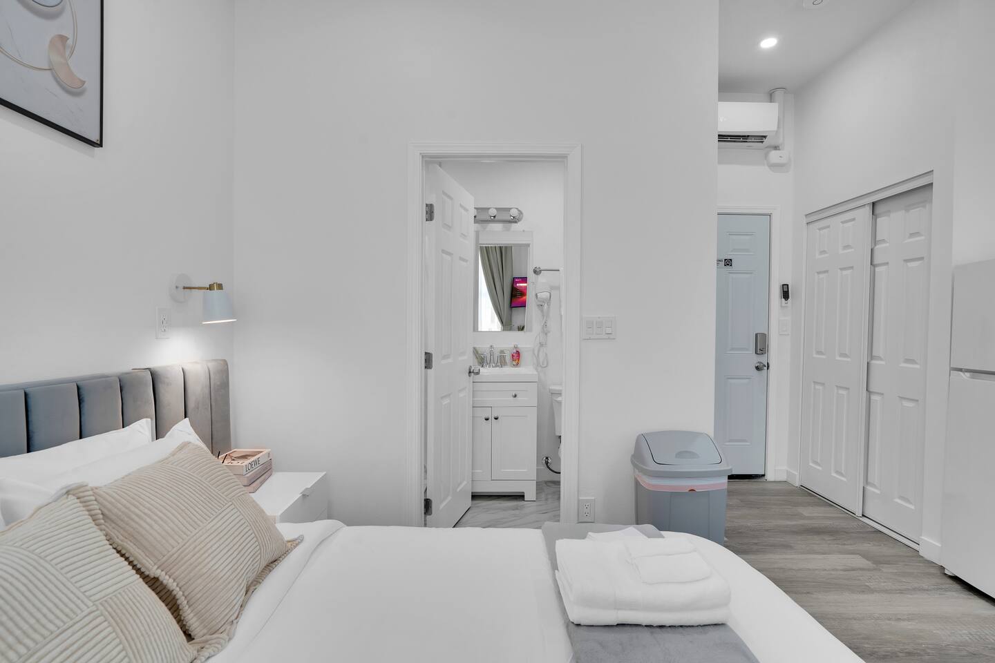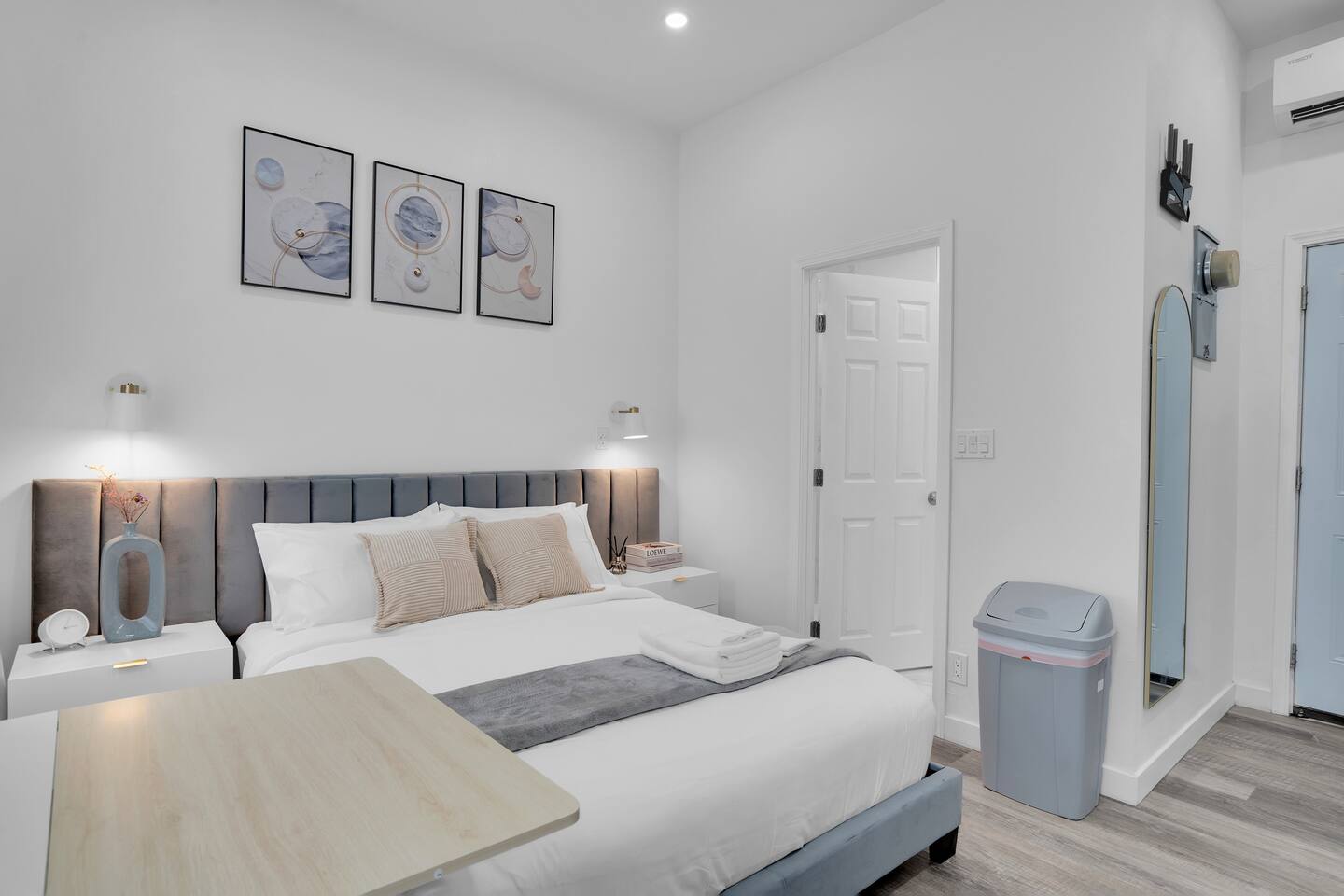 350 sq. ft. | Apartment / Studio | Second-floor unit BEDROOM : Queen bed | Wall mounted smart TV | Closet | Iron and ironing board | Split AC BATHROOM : Rain shower head | Handheld shower | Shampoo | Conditioner | Body wash | Hairdryer | Toilet paper | Towels KITCHEN / DINING AREA : Stove | Oven | Refrigerator | Microwave | Toaster | Water Kettle | Coffee maker | Brita Water Filter | Cooking utensils | Silverware | Oven mitts | Plates and bowls | Mugs, cups, wine glasses | Dining table AC/HEAT : Split AC is used in this unit LAUNDRY ROOM : - In building (7AM - 10 PM) - Shared - Coin Operated PARKING : Parking at back of the property. Street parking also available ELECTRIC CAR : Tesla Supercharger available across the street LOCATION : Ontario Central Downtown | Commercial area on ground floor Driving distances : Ontario International Airport - 3.7 mi, Ontario Convention Center - 3 mi, Ontario Mills Shopping Mall - 6.6 mi, Cucamonga-Guasti Regional Park - 4.7 mi, Downtown Los Angeles - 41.6 mi, Los Angeles International Airport - 54.7 mi, Disneyland - 30.2 mi, Universal Studios - 49.3 mi.