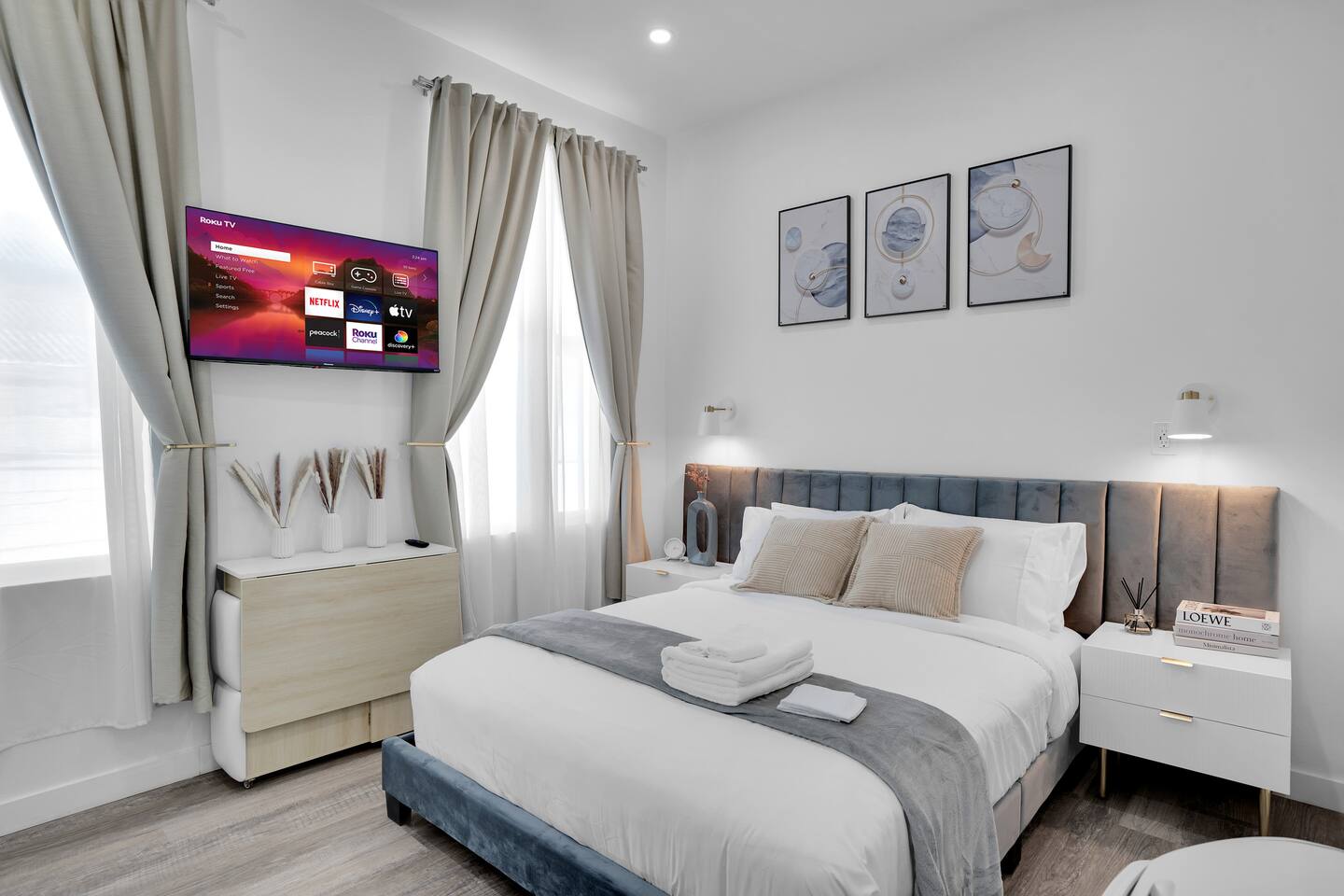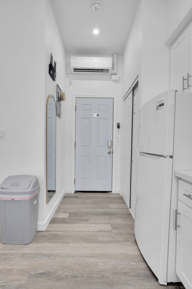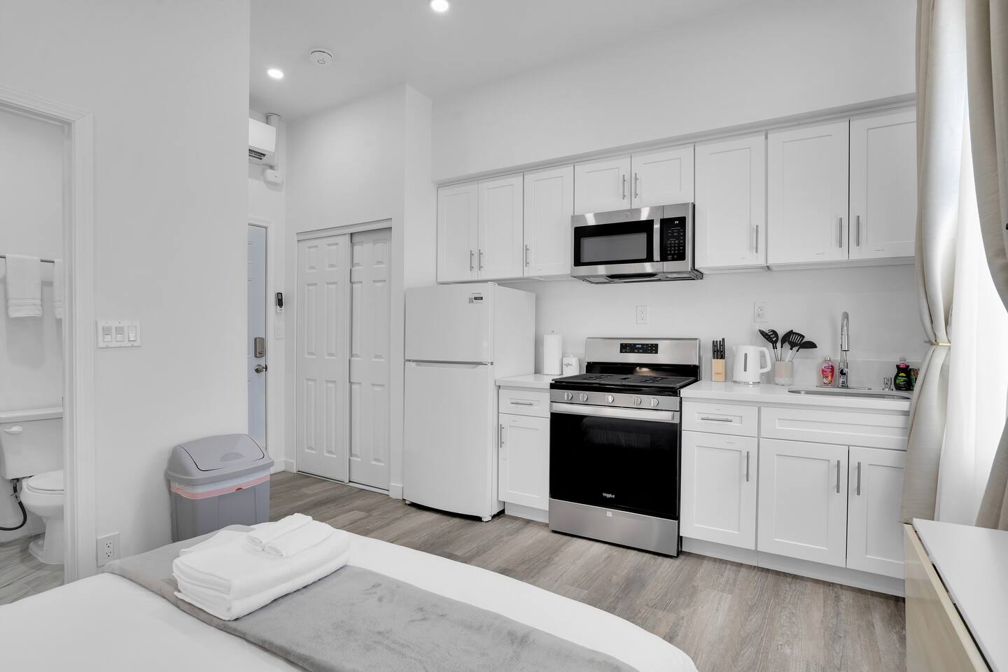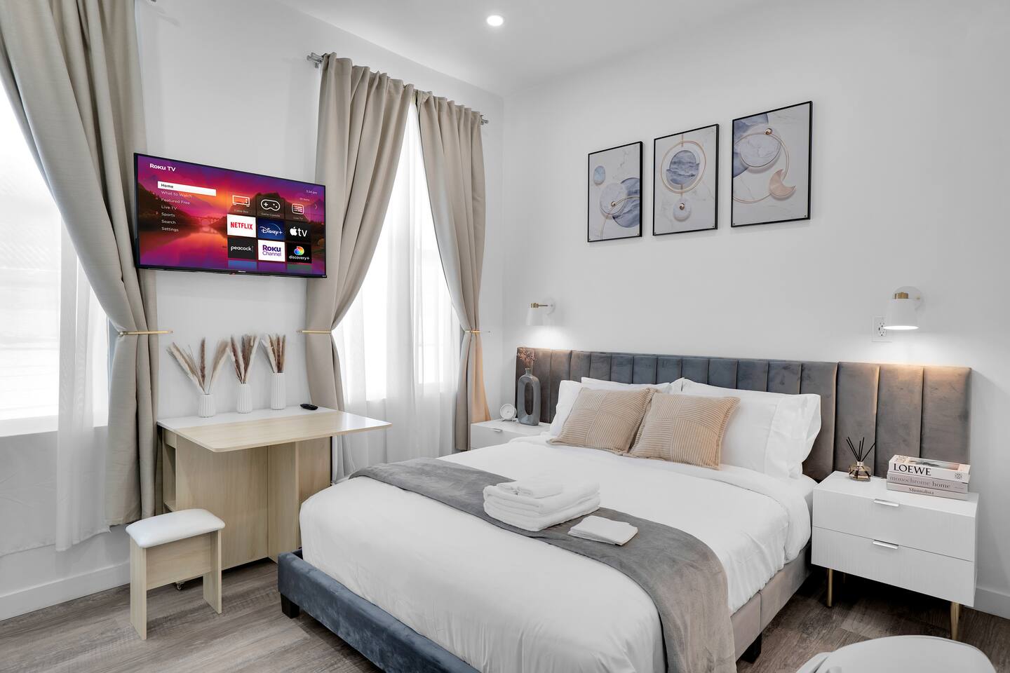 350 sq. ft. | Apartment / Studio | Second-floor unit BEDROOM : Queen bed | Wall mounted smart TV | Closet | Iron and ironing board | Split AC BATHROOM : Rain shower head | Handheld shower | Shampoo | Conditioner | Body wash | Hairdryer | Toilet paper | Towels KITCHEN / DINING AREA : Stove | Oven | Refrigerator | Microwave | Toaster | Water Kettle | Coffee maker | Brita Water Filter | Cooking utensils | Silverware | Oven mitts | Plates and bowls | Mugs, cups, wine glasses | Dining table AC/HEAT : Split AC is used in this unit LAUNDRY ROOM : - In building (7AM - 10 PM) - Shared - Coin Operated PARKING : Parking at back of the property. Street parking also available ELECTRIC CAR : Tesla Supercharger available across the street LOCATION : Ontario Central Downtown | Commercial area on ground floor Driving distances : Ontario International Airport - 3.7 mi, Ontario Convention Center - 3 mi, Ontario Mills Shopping Mall - 6.6 mi, Cucamonga-Guasti Regional Park - 4.7 mi, Downtown Los Angeles - 41.6 mi, Los Angeles International Airport - 54.7 mi, Disneyland - 30.2 mi, Universal Studios - 49.3 mi.