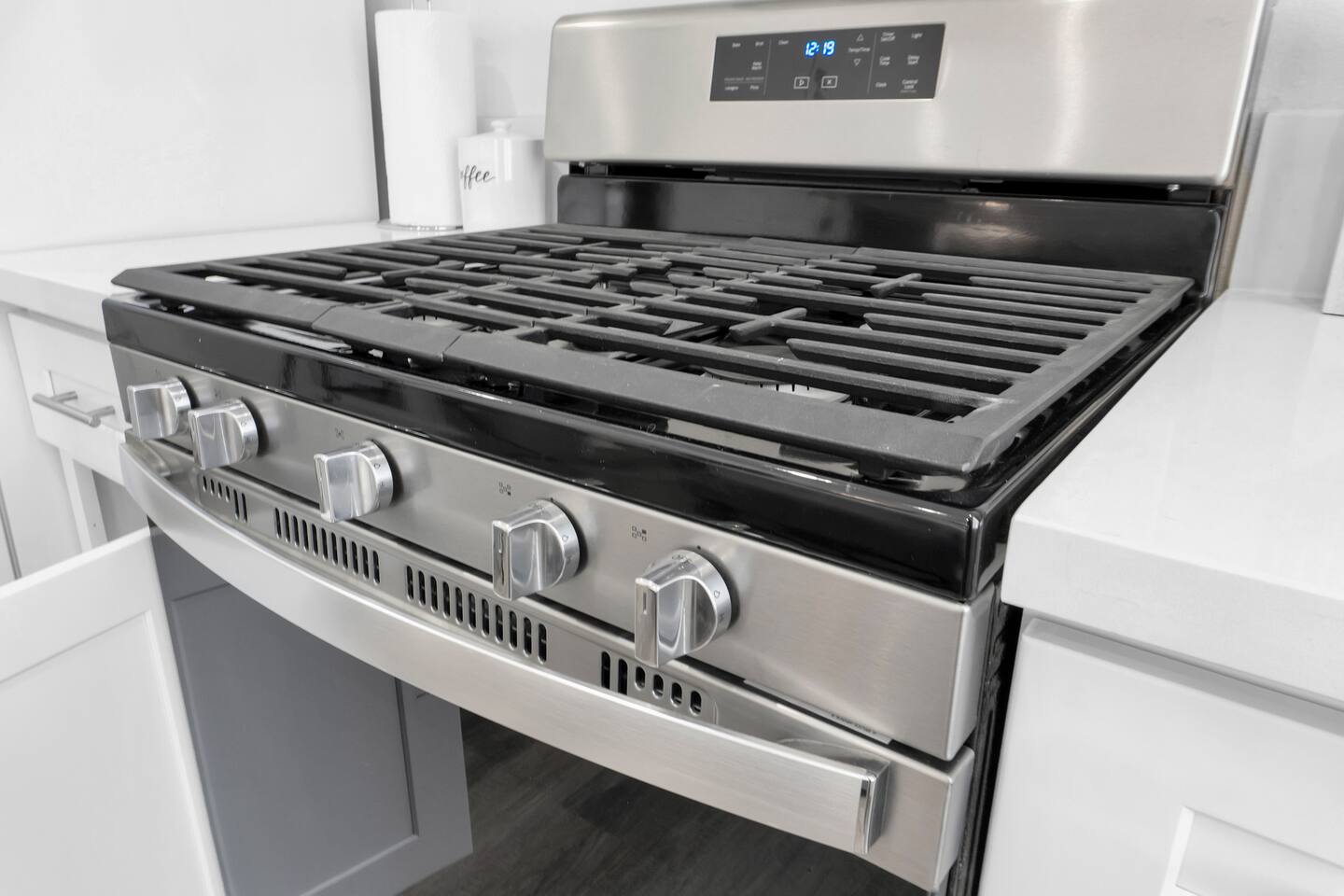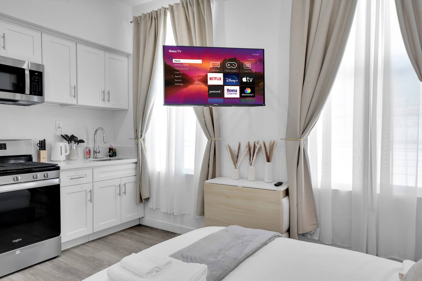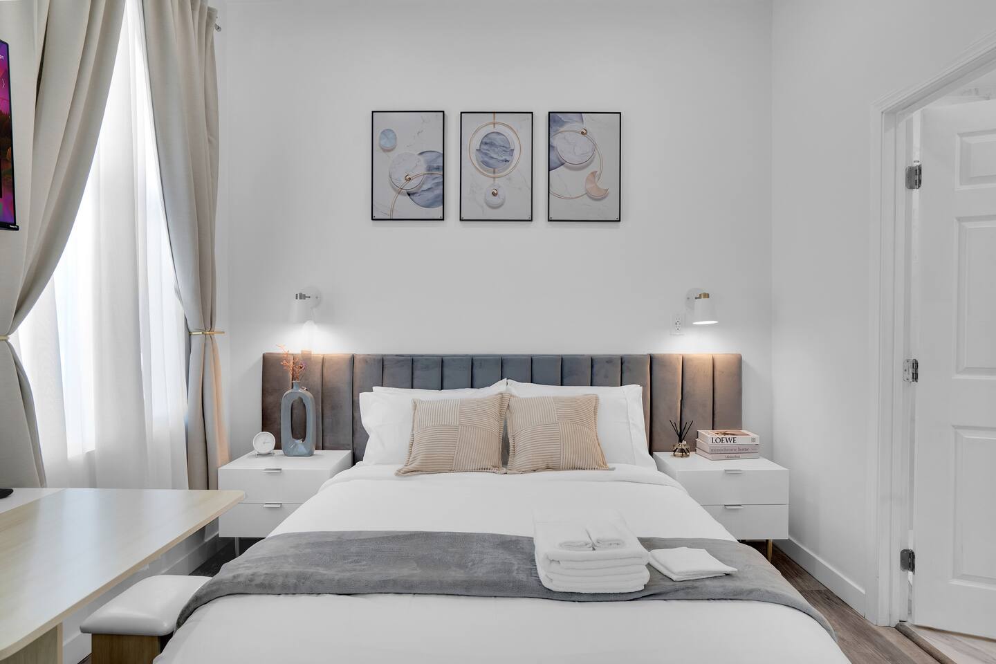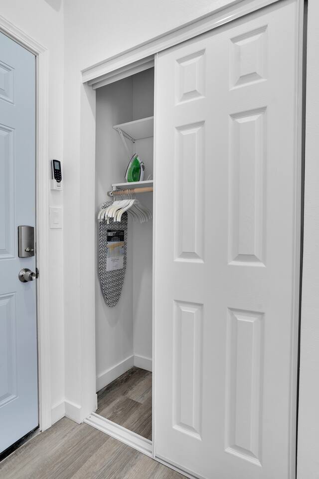350 sq. ft. | Apartment / Studio | Second-floor unit BEDROOM : Queen bed | Wall mounted smart TV | Closet | Iron and ironing board | Split AC BATHROOM : Rain shower head | Handheld shower | Shampoo | Conditioner | Body wash | Hairdryer | Toilet paper | Towels KITCHEN / DINING AREA : Stove | Oven | Refrigerator | Microwave | Toaster | Water Kettle | Coffee maker | Brita Water Filter | Cooking utensils | Silverware | Oven mitts | Plates and bowls | Mugs, cups, wine glasses | Dining table AC/HEAT : Split AC is used in this unit LAUNDRY ROOM : - In building (7AM - 10 PM) - Shared - Coin Operated PARKING : Parking at back of the property. Street parking also available ELECTRIC CAR : Tesla Supercharger available across the street LOCATION : Ontario Central Downtown | Commercial area on ground floor Driving distances : Ontario International Airport - 3.7 mi, Ontario Convention Center - 3 mi, Ontario Mills Shopping Mall - 6.6 mi, Cucamonga-Guasti Regional Park - 4.7 mi, Downtown Los Angeles - 41.6 mi, Los Angeles International Airport - 54.7 mi, Disneyland - 30.2 mi, Universal Studios - 49.3 mi.