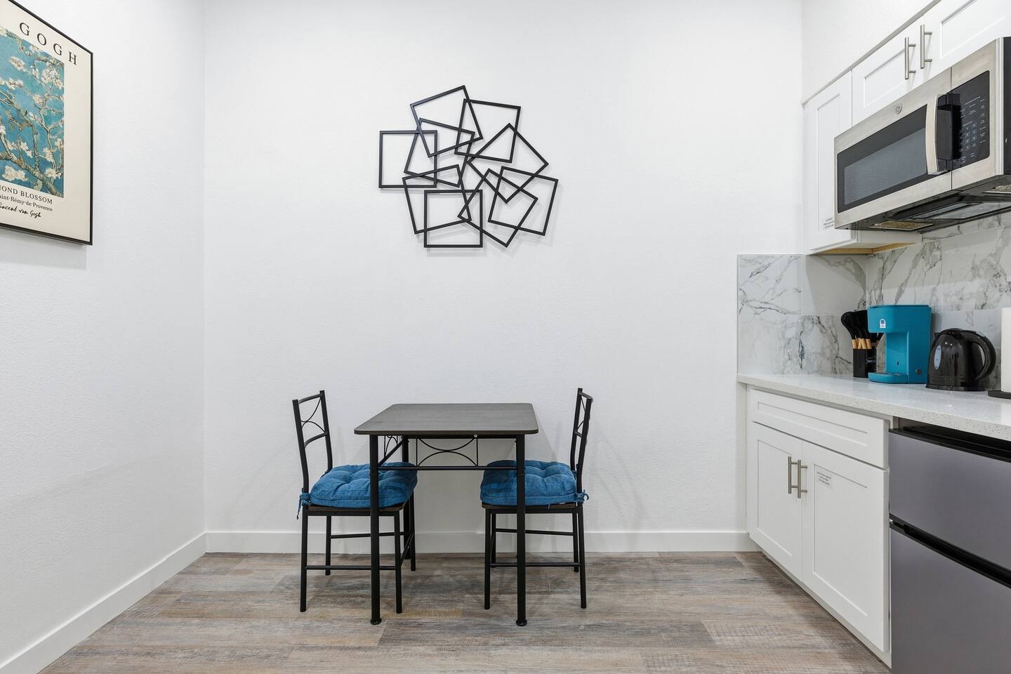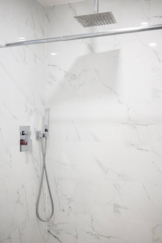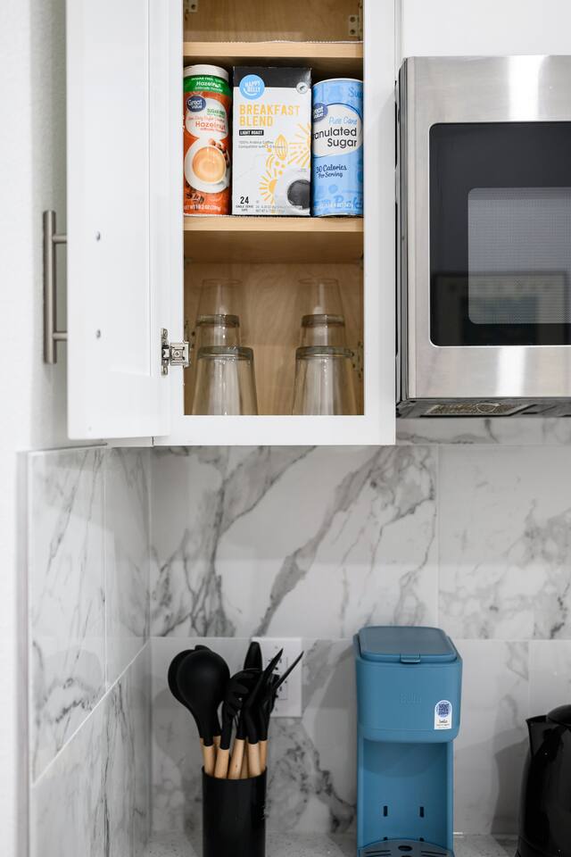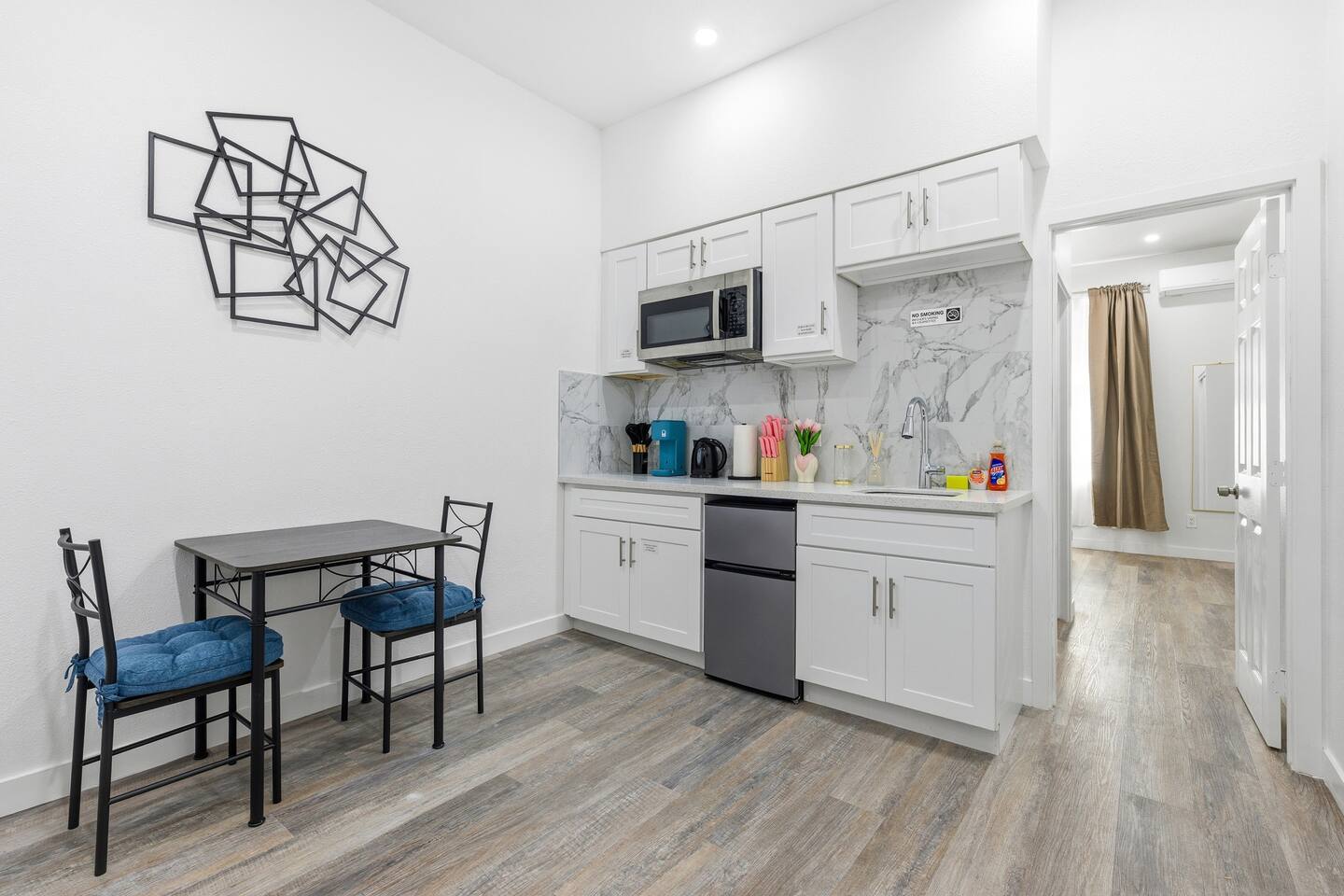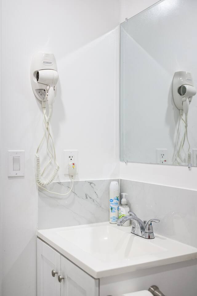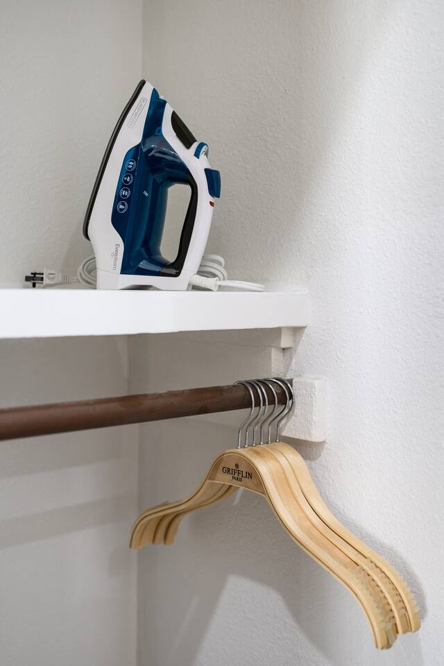 This is a compact studio layout without a separate living room. The space has been carefully arranged to include a functional kitchenette, a comfortable bed, and a bathroom with a standard shower. 500 sq. ft. | Apartment / Studio | Second-floor unit BEDROOM : • ROOM 1 : Queen bed | Wall mounted smart TV | Iron and ironing board | Split AC BATHROOM : Rain shower head | Handheld shower | Shampoo | Conditioner | Body wash | Hairdryer | Toilet paper | Towels KITCHEN / DINING AREA : induction cooker | Refrigerator | Microwave | Toaster | Water Kettle | Coffee maker | Brita Water Filter | Cooking utensils | Silverware | Plates and bowls | Mugs, cups, wine glasses | Dining table