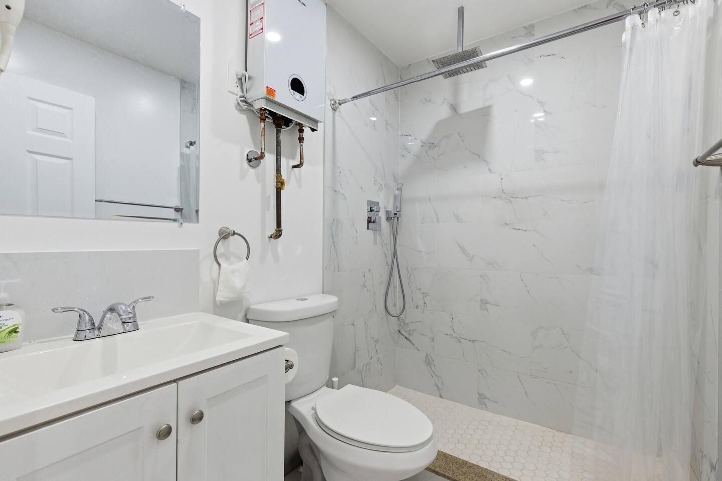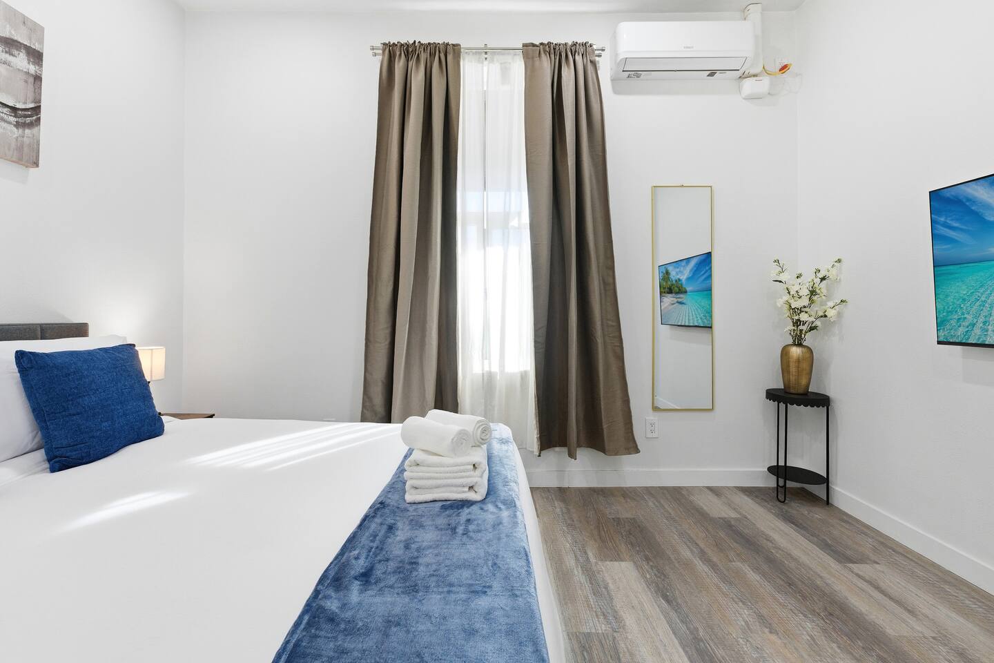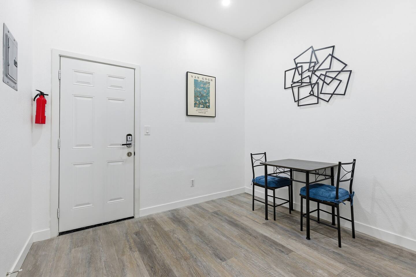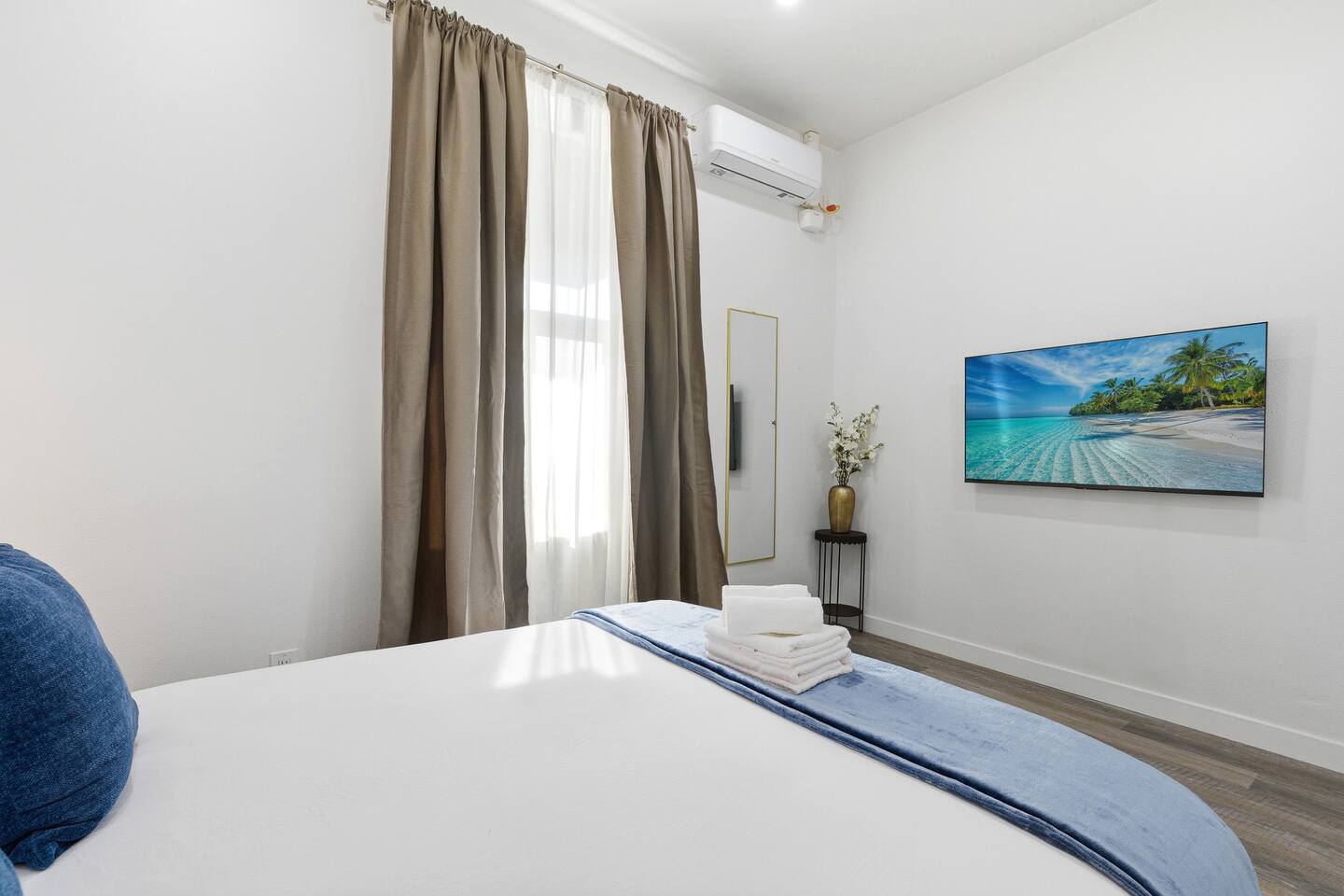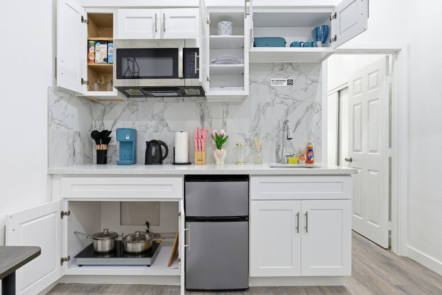 This is a compact studio layout without a separate living room. The space has been carefully arranged to include a functional kitchenette, a comfortable bed, and a bathroom with a standard shower. 500 sq. ft. | Apartment / Studio | Second-floor unit BEDROOM : • ROOM 1 : Queen bed | Wall mounted smart TV | Iron and ironing board | Split AC BATHROOM : Rain shower head | Handheld shower | Shampoo | Conditioner | Body wash | Hairdryer | Toilet paper | Towels KITCHEN / DINING AREA : induction cooker | Refrigerator | Microwave | Toaster | Water Kettle | Coffee maker | Brita Water Filter | Cooking utensils | Silverware | Plates and bowls | Mugs, cups, wine glasses | Dining table