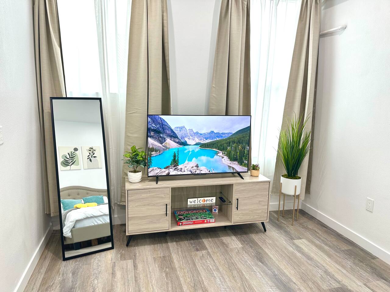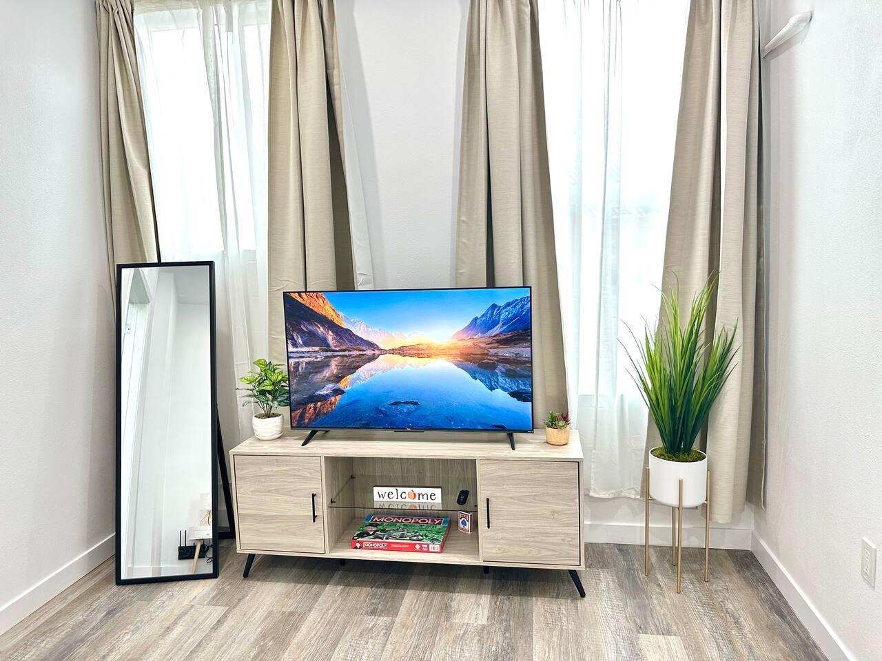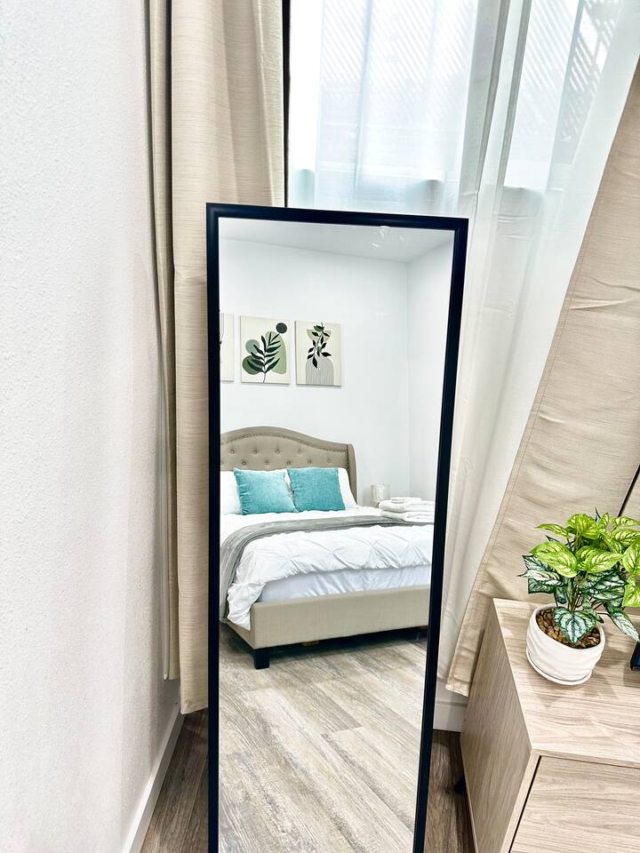 650 sq. ft. | Apartment | Second-floor unit BEDROOM : • ROOM 1 : Queen bed | smart TV | Closet | Iron and ironing board | Split AC | Board Games BATHROOM : Rain shower head | Handheld shower | Shampoo | Conditioner | Body wash | Hairdryer | Toilet paper | Towels KITCHEN / DINING AREA : Stove | Oven | Refrigerator | Microwave | Toaster | Water Kettle | Coffee maker | Brita Water Filter | Cooking utensils | Silverware | Oven mitts | Plates and bowls | Mugs, cups, wine glasses | Dining table AC/HEAT : Split AC is used in this unit LAUNDRY ROOM : - In building (7AM - 10 PM) - Shared - Coin Operated PARKING : Parking at back of the property. Street parking also available ELECTRIC CAR : Tesla Supercharger available across the street LOCATION : Ontario Central Downtown | Commercial area on ground floor Driving distances : Ontario International Airport - 3.7 mi, Ontario Convention Center - 3 mi, Ontario Mills Shopping Mall - 6.6 mi, Cucamonga-Guasti Regional Park - 4.7 mi, Downtown Los Angeles - 41.6 mi, Los Angeles International Airport - 54.7 mi, Disneyland - 30.2 mi, Universal Studios - 49.3 mi.